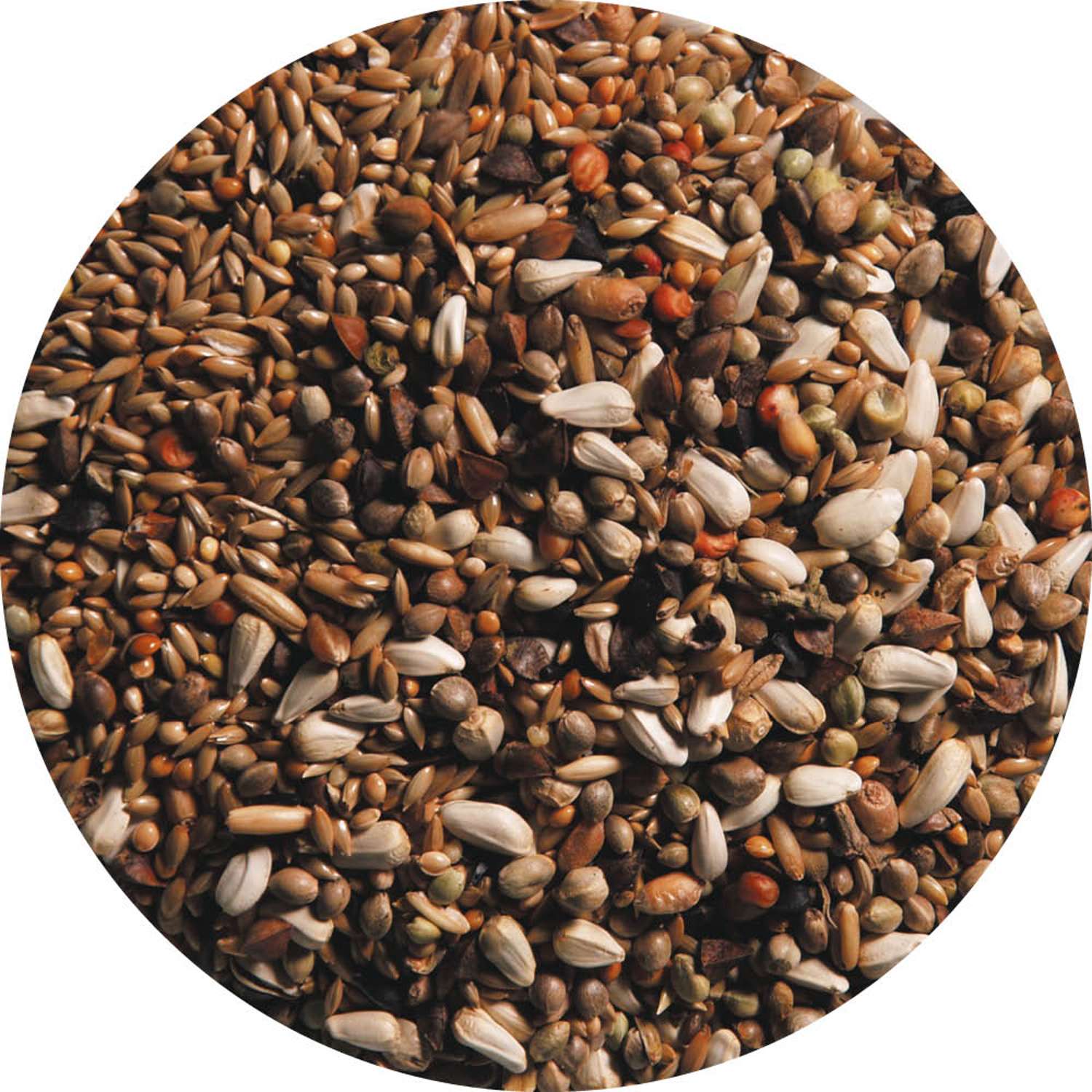 Kanariefrø, hamp, safflor, gul hirse, boghvede, afskallet havre, hvid hirse, hvede, rød dari, nigerfrø.