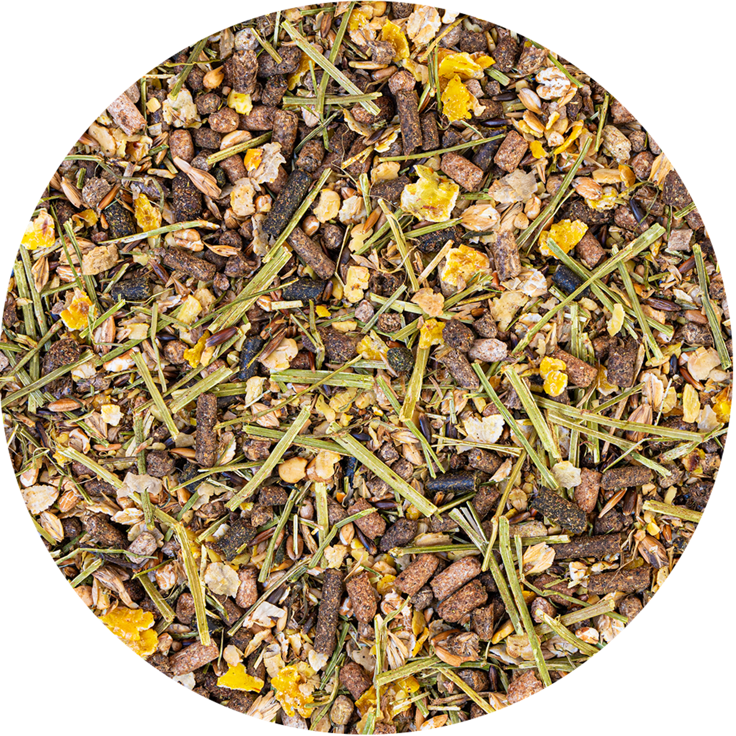 | Ingredienser | Hvedeklid, Sojabønner (non GMO), hørfrø klid, Sort havre, byg, majs, lucerne, Fermenterede lucerne piller, Rapsolie, Puffet byg, Spelt, Hørfrø, Sukkerroepulp, majsmask, hestebønneskaller, Rapskagemel, Ærter, Cikorie |