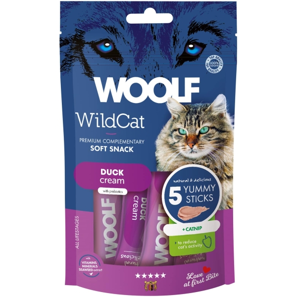 Woolf Wildcat Cat Cream med and og catnip (katteurt) er en cremet godbid, der kombinerer en lækker smag med høj kvalitet. Catnip kan have en reducerene effekt på din kats aktivitetsniveau. Den bløde konsistens gør den perfekt som belønning, som topping på foder – eller direkte fra tuben for et hyggeligt øjeblik, mellem dig og din kat.