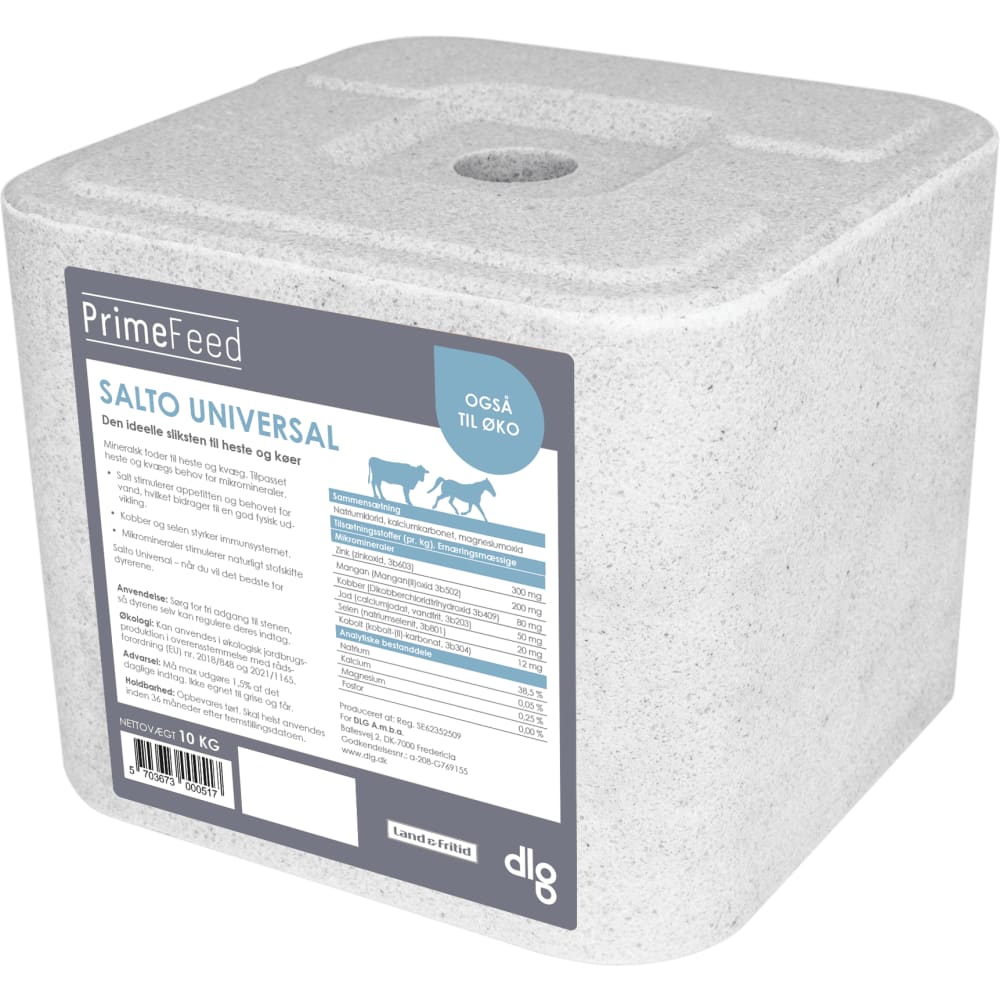 Salto® Universal er produceret med en speciel højtryksmetode, hvilket gør saltstenen holdbar ved håndtering og modstandsdygtig over for regn. Den består af naturligt bjergsalt tilsat mikromineraler og selen, som kan hjælpe med at modvirke stofskifteproblemer, nedsat tilvækst og lav mælkeproduktion.