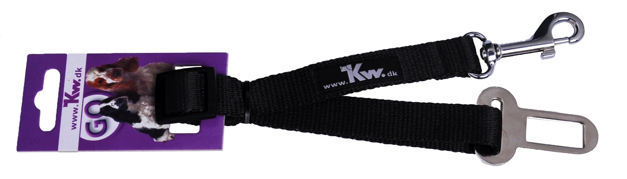 Sættes i hundens sikkerhedssele med karabinhagen og spændet klikkes i bilens sikkerhedsselelås.