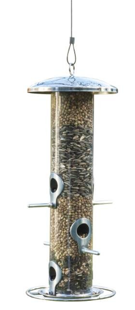 Foderautomat til vildtfuglefrø. Plads til flere fugle ad gangen.