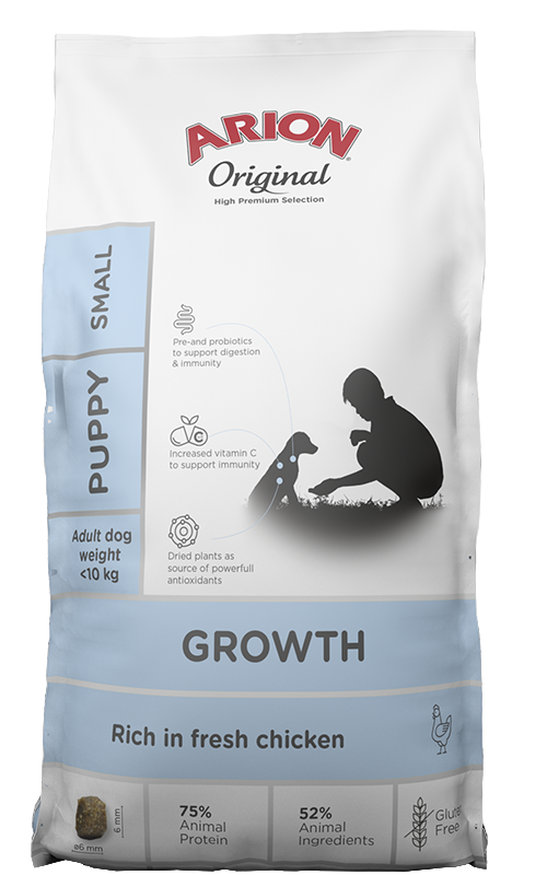 ARION Original Growth Chicken Small er et hvalpefoder, udviklet til at dække det større behov for næring og energi, som hvalpe af små hunderacer har. Bruges indtil 12 måneders alderen samt til drægtige og diegivende tæver. ARION Original Growth Chicken Small indeholder Ω3 fedtsyren DHA fra fiskeolie for at støtte hjernens udvikling og indlæringsevne hos hvalpe.