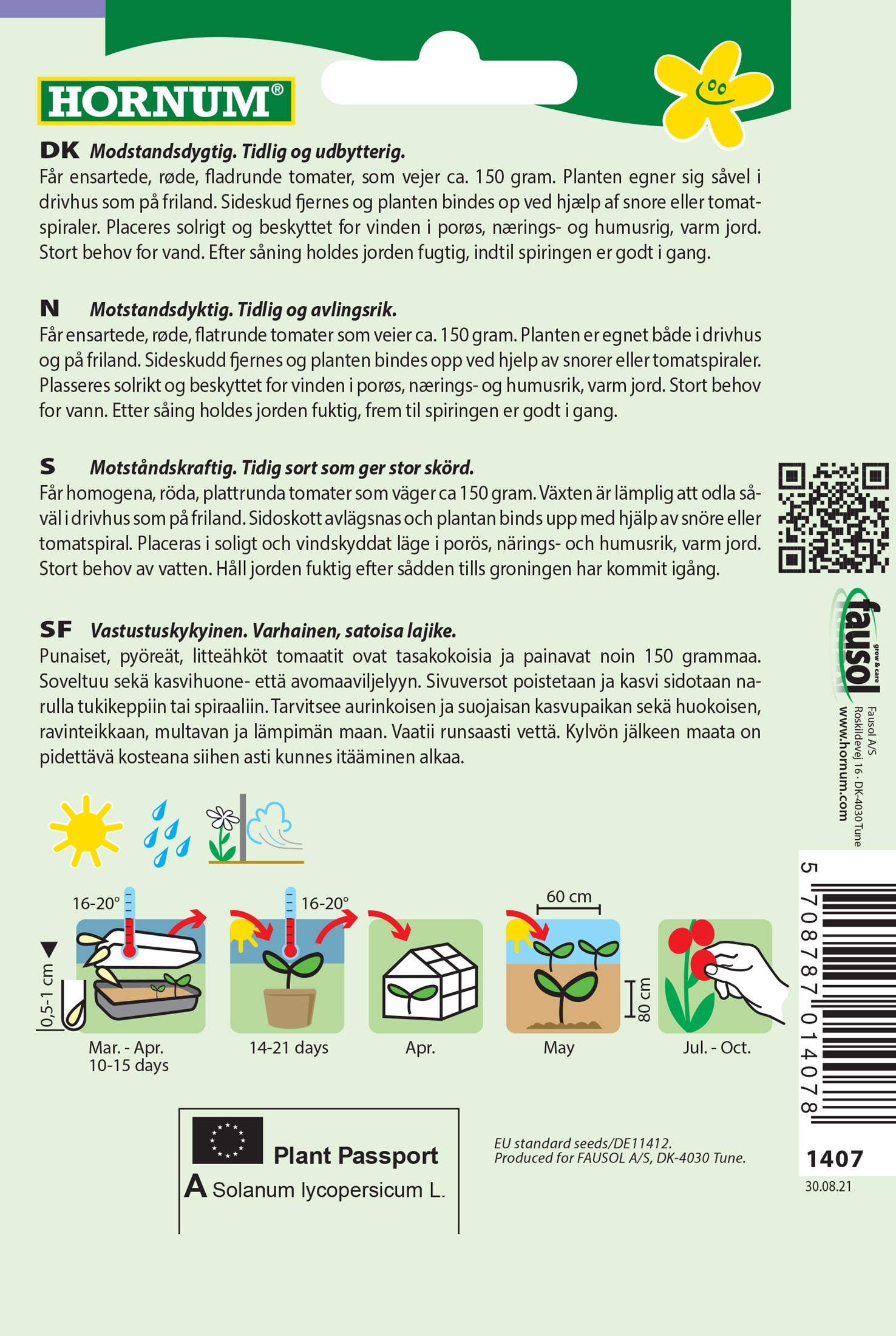Får ensartede, røde, fladrunde tomater, som vejer ca. 150 gram. Planten egner sig såvel i drivhus som på friland. Sideskud fjernes og planten bindes op ved hjælp af snore eller tomatspiraler. Placeres solrigt og beskyttet for vinden i porøs, nærings- og humusrig, varm jord. Stort behov for vand. Efter såning holdes jorden fugtig, indtil spiringen er godt i gang.