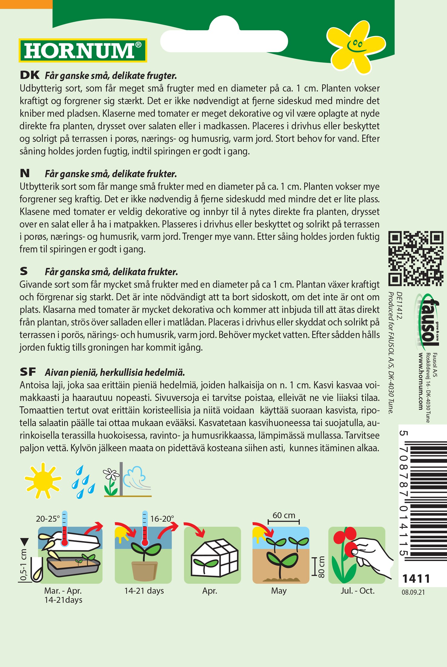 Udbytterig sort, som får talrige, små, gule, aromatiske tomater, som har størrelse som et kirsebær. Det er ikke nødvendigt at fjerne sideskud med mindre det kniber med pladsen.