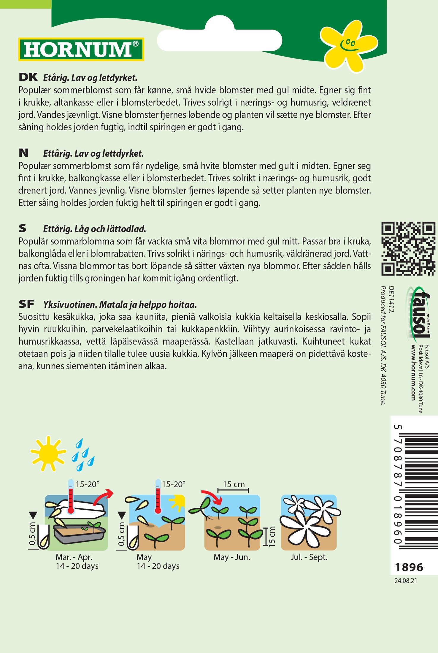 Populær sommerblomst som får kønne, små hvide blomster med gul midte. Egner sig fint i krukke, altankasse eller i blomsterbedet. Trives solrigt i nærings- og humusrig, veldrænet jord. Vandes jævnligt. Visne blomster fjernes løbende og planten vil sætte nye blomster. Efter såning holdes jorden fugtig, indtil spiringen er godt i gang.