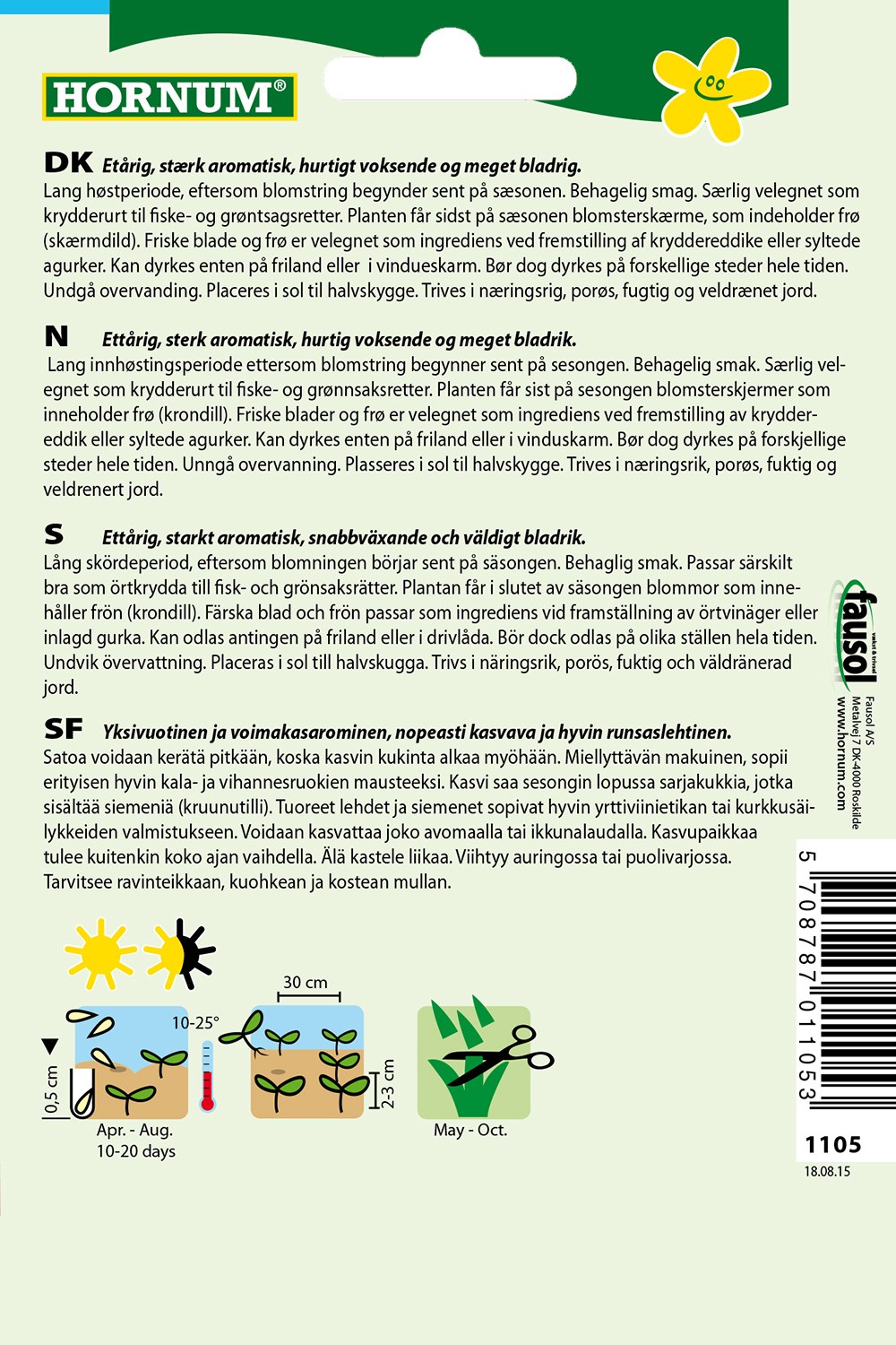 Lang høstperiode, eftersom blomstring begynder sent på sæsonen. Behagelig smag. Særlig velegnet som krydderurt til fiske- og grøntsagsretter. Planten får sidst på sæsonen blomsterskærme, som indeholder frø (skærmdild). Friske blade og frø er velegnet som ingrediens ved fremstilling af kryddereddike eller syltede agurker. Kan dyrkes enten på friland eller i vindueskarm. Bør dog dyrkes på forskellige steder hele tiden. Undgå overvanding. Placeres i sol til halvskygge. Trives i næringsrig, porøs, fugtig og veldrænet jord.