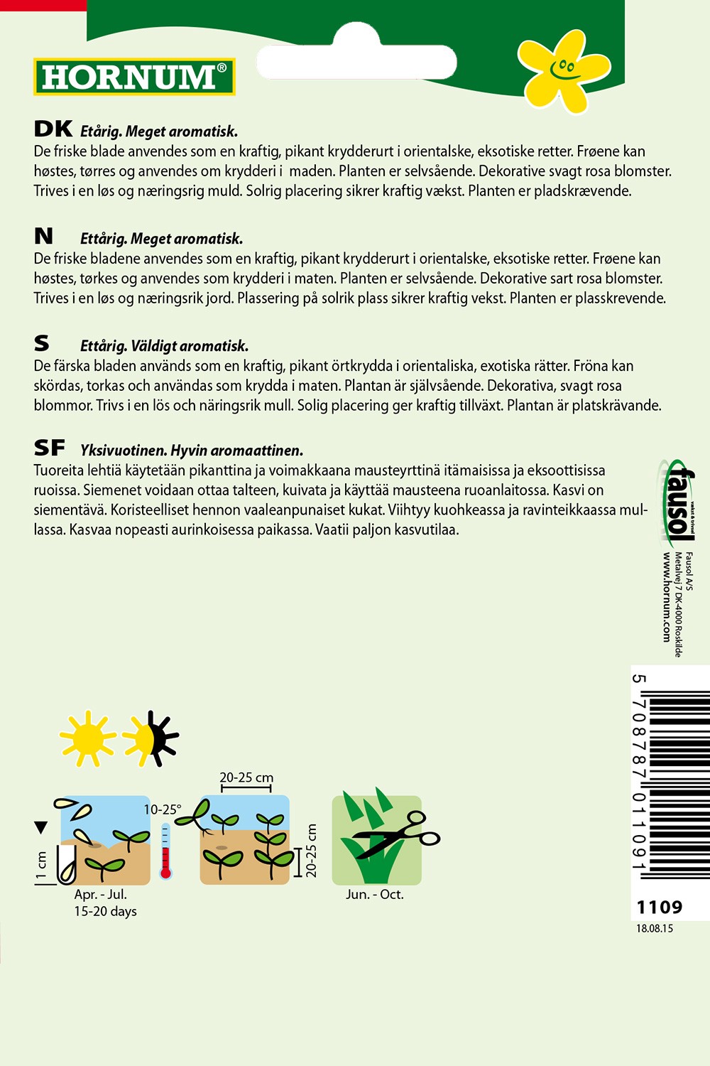 De friske blade anvendes som en kraftig, pikant krydderurt i orientalske, eksotiske retter. Frøene kan høstes, tørres og anvendes om krydderi i maden. Planten er selvsående. Dekorative svagt rosa blomster. Trives i en løs og næringsrig muld. Solrig placering sikrer kraftig vækst. Planten er pladskrævende.