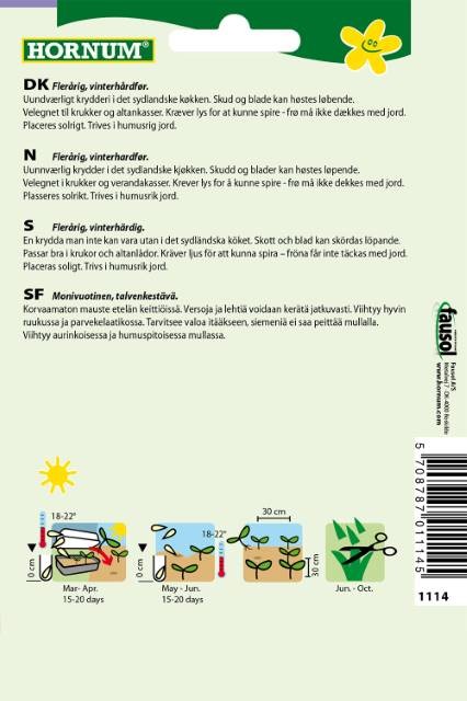 Uundværligt krydderi i det sydlandske køkken. Skud og blade kan høstes løbende. Velegnet til krukker og altankasser. Kræver lys for at kunne spire - frø må ikke dækkes med jord. Placeres solrigt. Trives i humusrig jord.