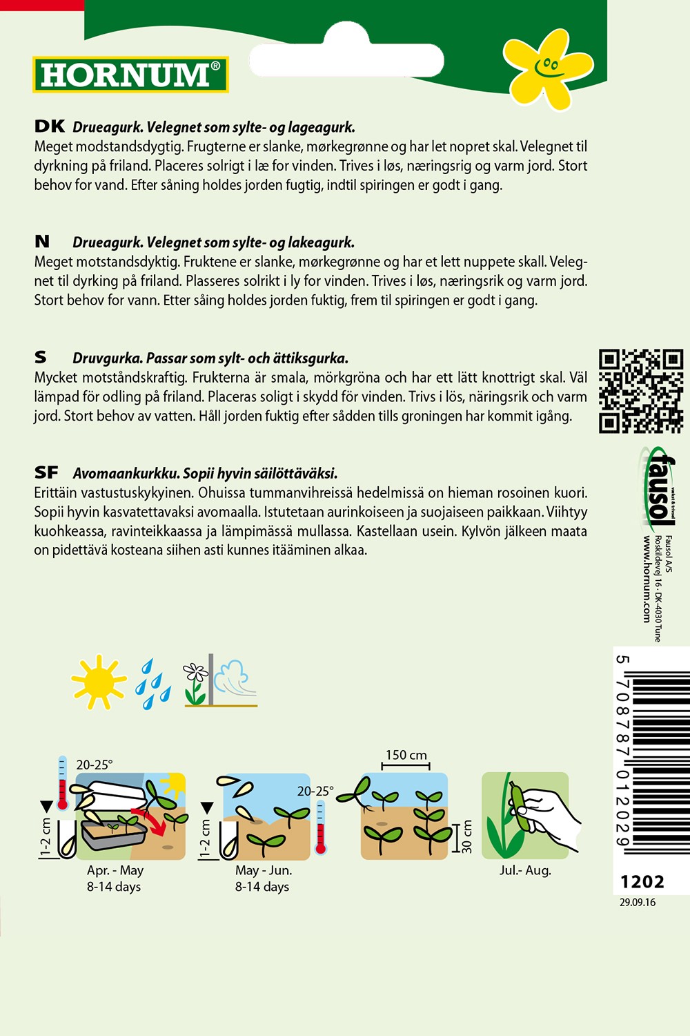 Meget modstandsdygtig. Frugterne er slanke, mørkegrønne og har let nopret skal. Velegnet til dyrkning på friland. Placeres solrigt i læ for vinden. Trives i løs, næringsrig og varm jord. Stort behov for vand.