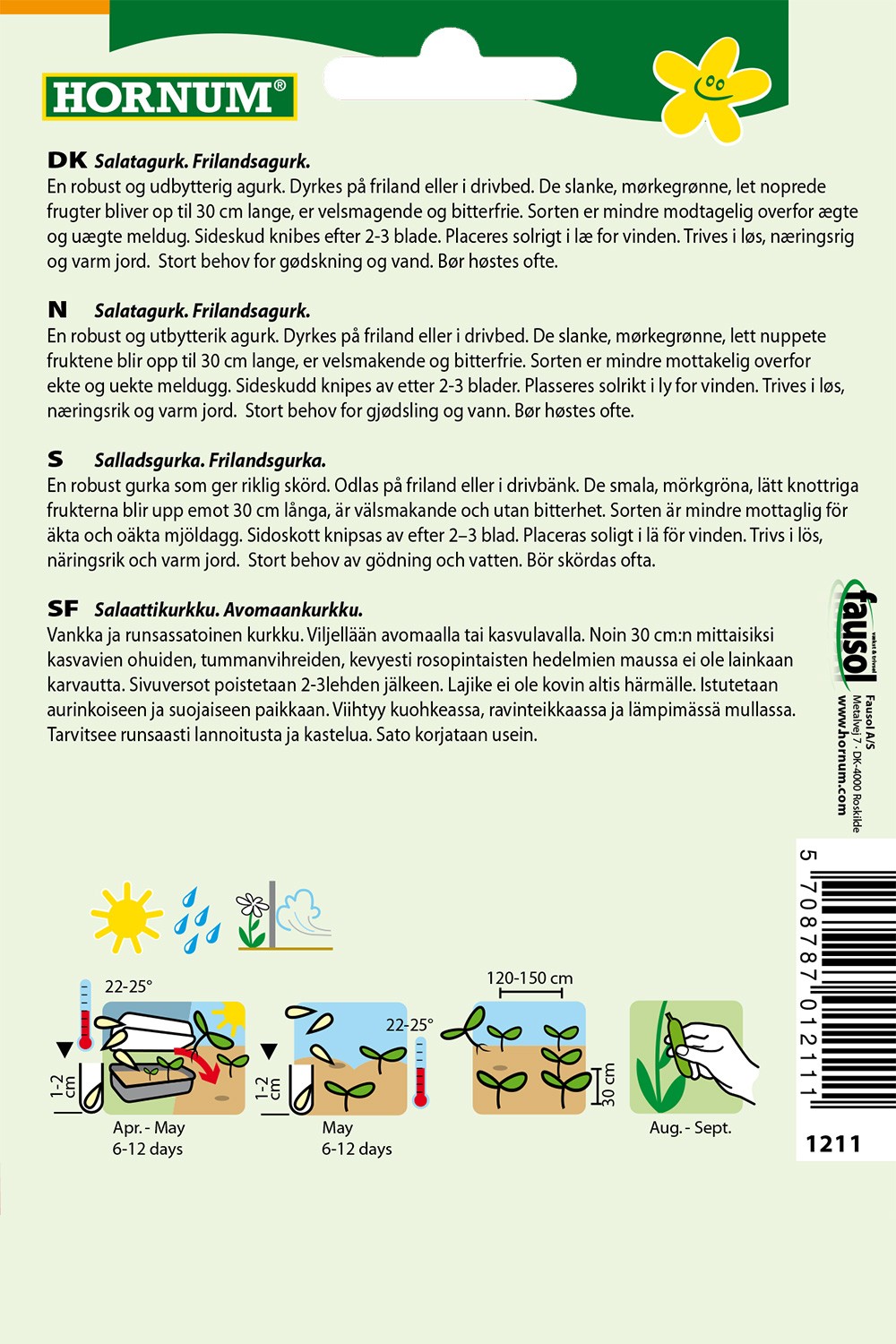 En robust og udbytterig agurk. Dyrkes på friland eller i drivbed. De slanke, mørkegrønne, let noprede frugter bliver op til 30 cm lange, er velsmagende og bitterfrie. Sorten er mindre modtagelig overfor ægte og uægte meldug. Sideskud knibes efter 2-3 blade. Placeres solrigt i læ for vinden. Trives i løs, næringsrig og varm jord. Stort behov for gødskning og vand. Bør høstes ofte.