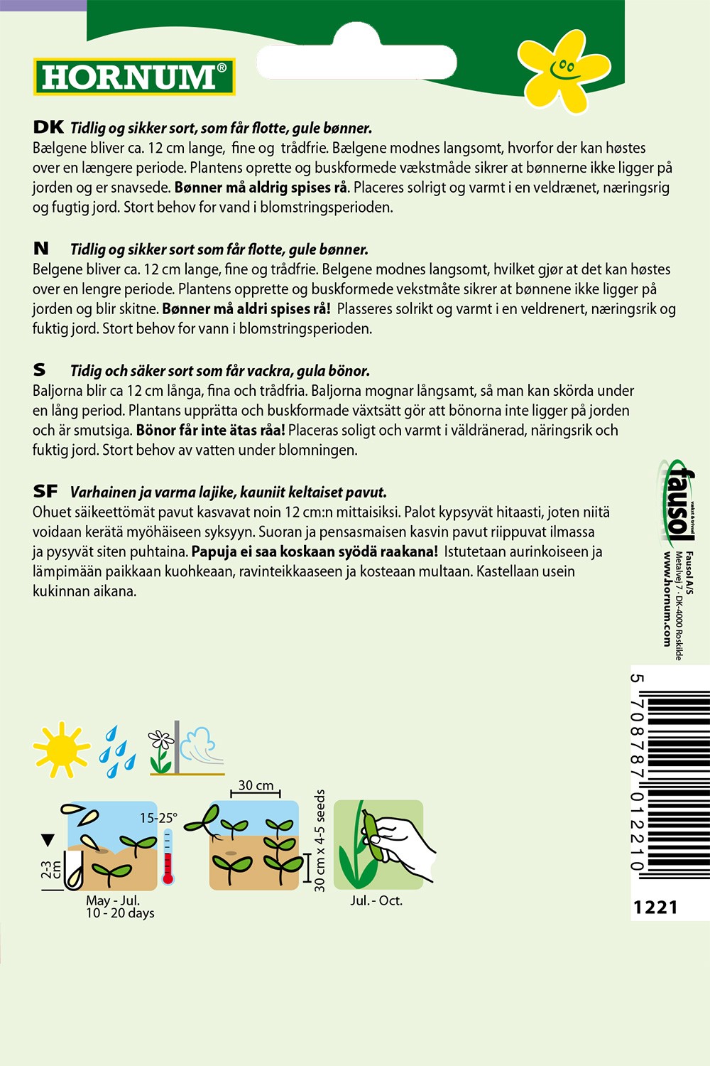 Bælgene bliver ca. 12 cm lange, fine og trådfrie. Bælgene modnes langsomt, hvorfor der kan høstes over en længere periode. Plantens oprette og buskformede vækstmåde sikrer at bønnerne ikke ligger på jorden og er snavsede. Bønner må aldrig spises rå. Placeres solrigt og varmt i en veldrænet, næringsrig og fugtig jord. Stort behov for vand i blomstringsperioden.