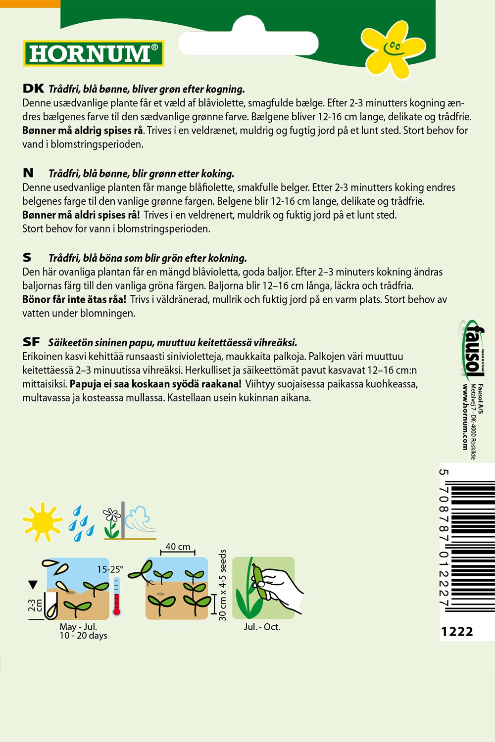 Denne usædvanlige plante får et væld af blåviolette, smagfulde bælge. Efter 2-3 minutters kogning ændres bælgenes farve til den sædvanlige grønne farve. Bælgene bliver 12-16 cm lange, delikate og trådfrie. Bønner må aldrig spises rå. Trives i en veldrænet, muldrig og fugtig jord på et lunt sted. Stort behov for vand i blomstringsperioden.