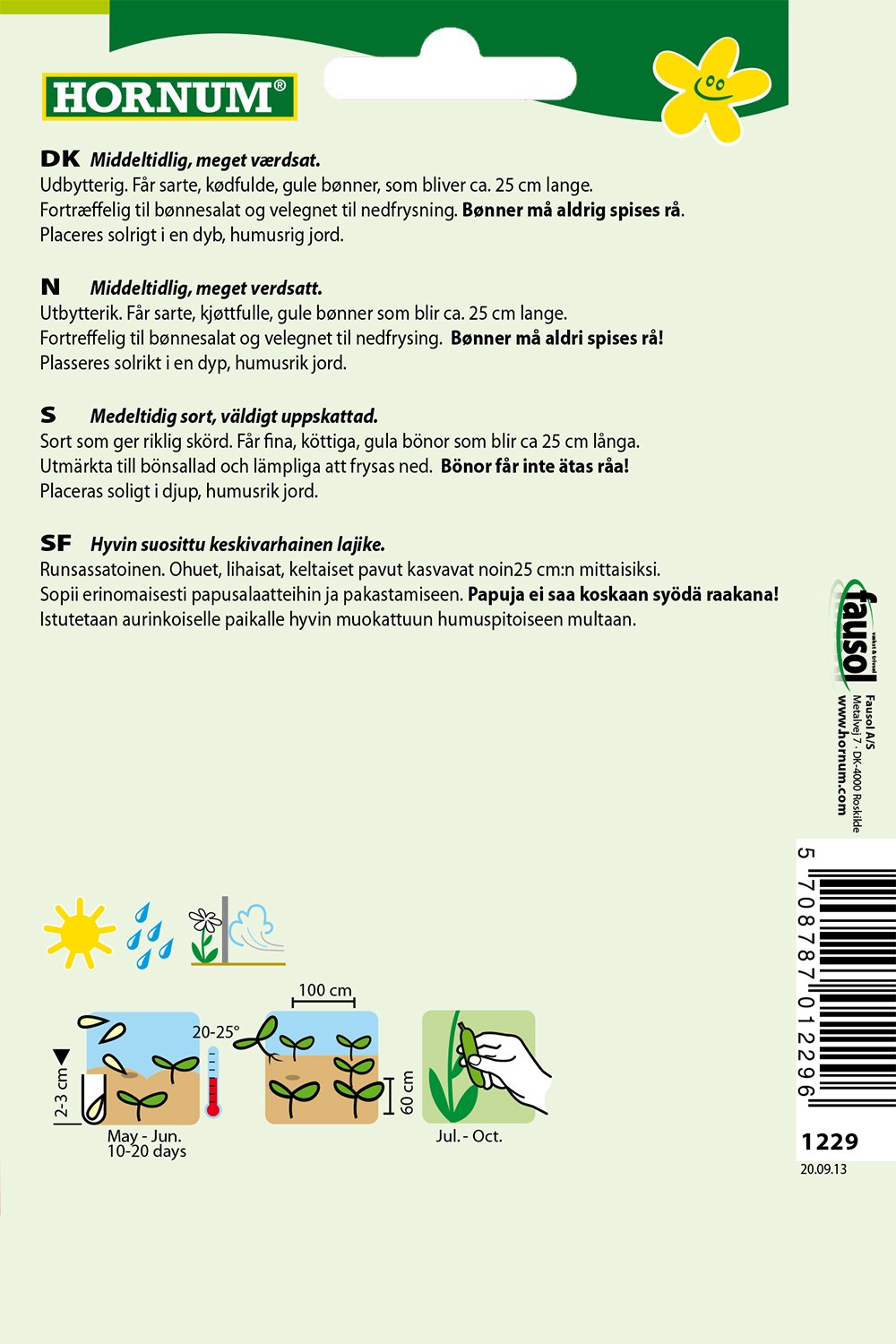 Udbytterig. Får sarte, kødfulde, gule bønner, som bliver ca. 25 cm lange. Fortræffelig til bønnesalat og velegnet til nedfrysning. Bønner må aldrig spises rå. Placeres solrigt i en dyb, humusrig jord.