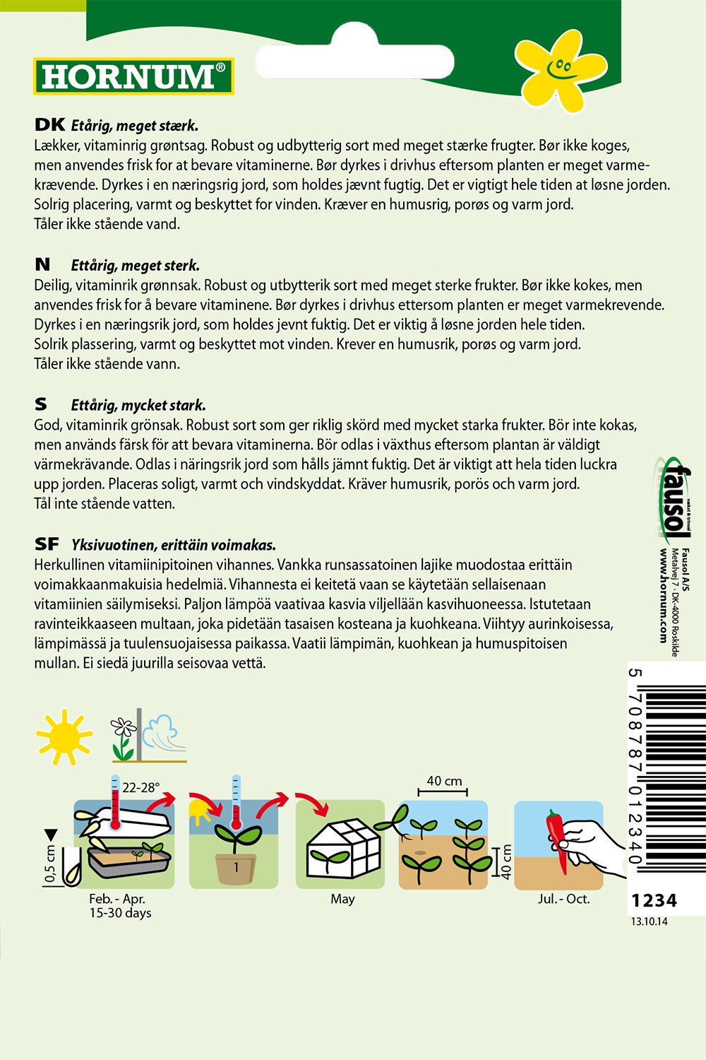 Lækker, vitaminrig grøntsag. Robust og udbytterig sort med meget stærke frugter. Bør ikke koges, men anvendes frisk for at bevare vitaminerne. Bør dyrkes i drivhus eftersom planten er meget varmekrævende. Dyrkes i en næringsrig jord, som holdes jævnt fugtig. Det er vigtigt hele tiden at løsne jorden. Solrig placering, varmt og beskyttet for vinden. Kræver en humusrig, porøs og varm jord. Tåler ikke stående vand.