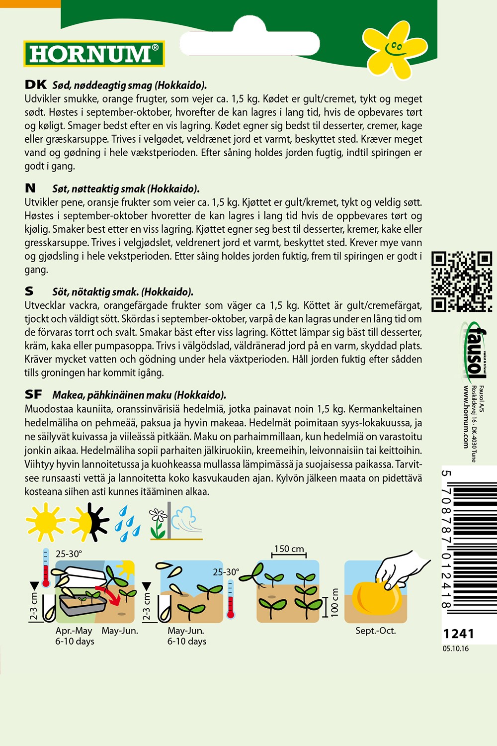 Udvikler smukke, orange frugter, som vejer ca. 1,5 kg. Kødet er gult/cremet, tykt og meget sødt. Høstes i september-oktober, hvorefter de kan lagres i lang tid, hvis de opbevares tørt og køligt. Smager bedst efter en vis lagring. Kødet egner sig bedst til desserter, cremer, kage eller græskarsuppe. Trives i velgødet, veldrænet jord et varmt, beskyttet sted. Kræver meget vand og gødning i hele vækstperioden.