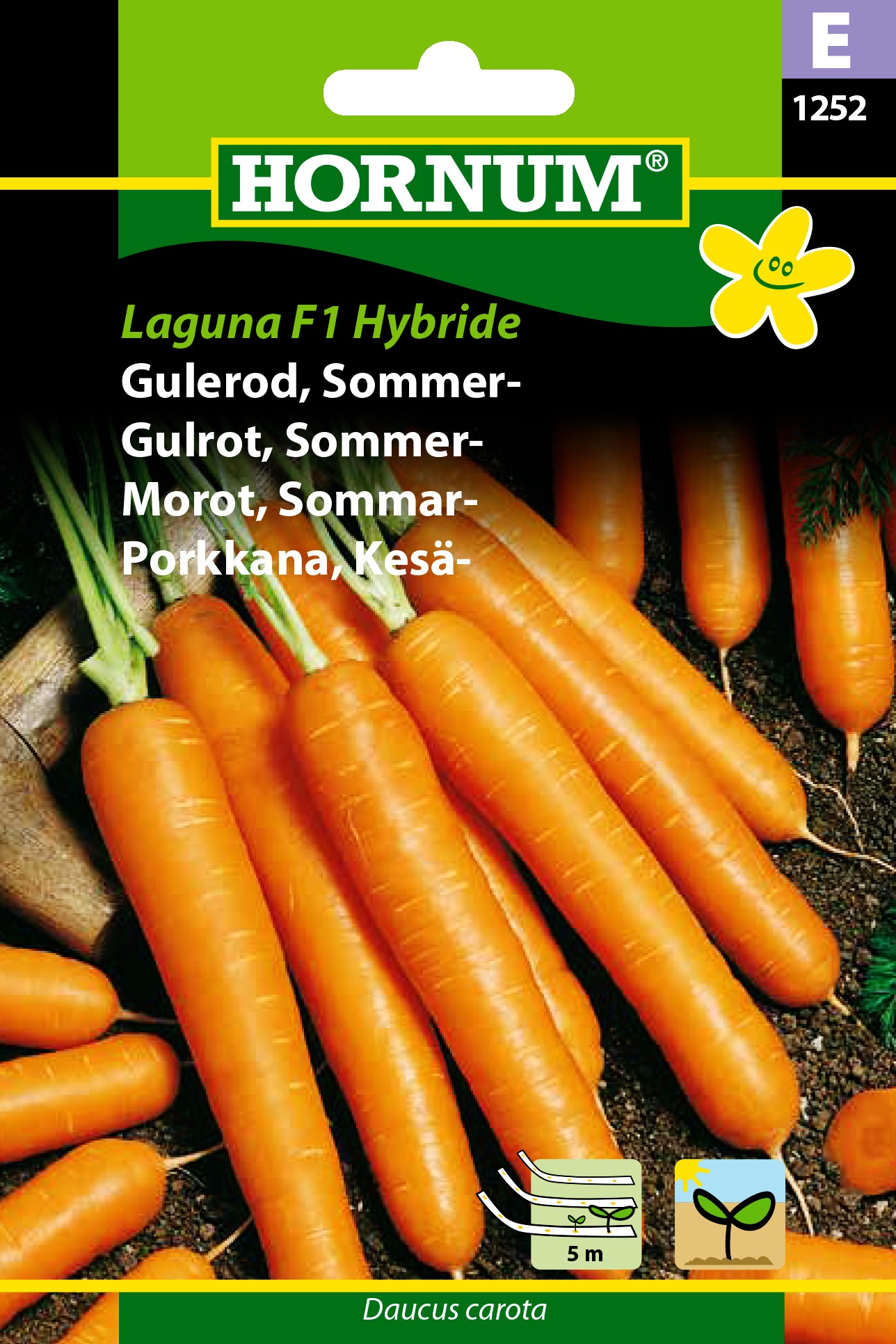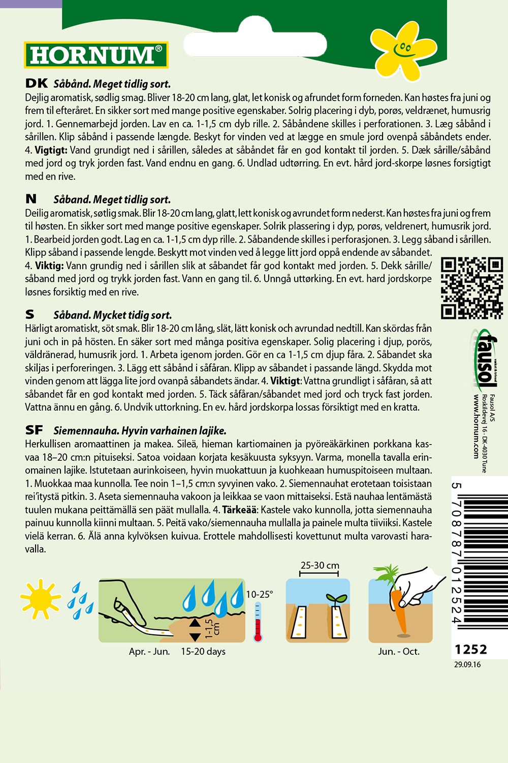 Dejlig aromatisk, sødlig smag. Bliver 18-20 cm lang, glat, let konisk og afrundet form forneden. Kan høstes fra juni og frem til efteråret. En sikker sort med mange positive egenskaber. Solrig placering i dyb, porøs, veldrænet, humusrig jord. Gennemarbejd jorden. Lav en ca. 1-1,5 cm dyb rille. Såbåndene skilles i perforationen. Læg såbånd i sårillen. Klip såbånd i passende længde. Beskyt for vinden ved at lægge en smule jord ovenpå såbåndets ender. Vigtigt: Vand grundigt ned i sårillen, således at såbåndet får en god kontakt til jorden.Dæk sårille/såbånd med jord og tryk jorden fast. Vand endnu en gang. Undlad udtørring. En evt. hård jordskorpe løsnes forsigtigt med en rive.