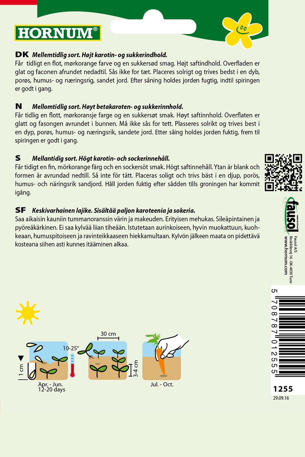 Får tidligt en flot, mørkorange farve og en sukkersød smag. Højt saftindhold. Overfladen er glat og faconen afrundet nedadtil. Sås ikke for tæt. Placeres solrigt og trives bedst i en dyb, porøs, humus- og næringsrig, sandet jord.