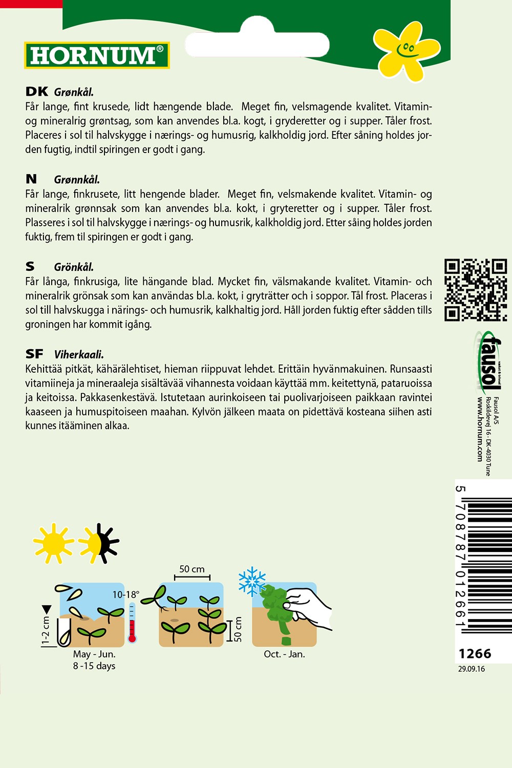 Får lange, fint krusede, lidt hængende blade. Meget fin, velsmagende kvalitet. Vitamin- og mineralrig grøntsag, som kan anvendes bl.a. kogt, i gryderetter og i supper. Tåler frost. Placeres i sol til halvskygge i nærings- og humusrig, kalkholdig jord.