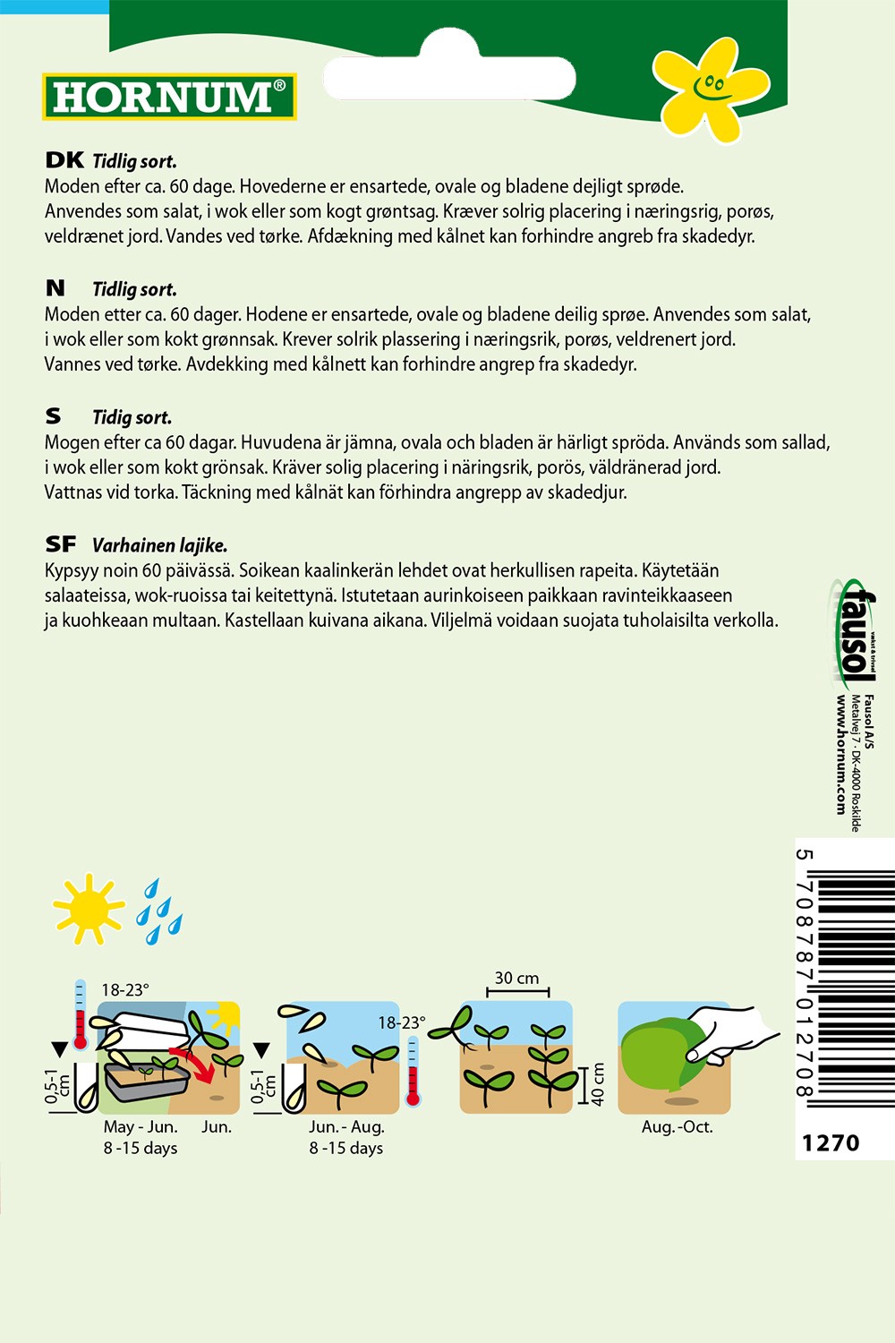 Moden efter ca. 60 dage. Hovederne er ensartede, ovale og bladene dejligt sprøde. Anvendes som salat, i wok eller som kogt grøntsag. Kræver solrig placering i næringsrig, porøs, veldrænet jord. Vandes ved tørke. Afdækning med kålnet kan forhindre angreb fra skadedyr.