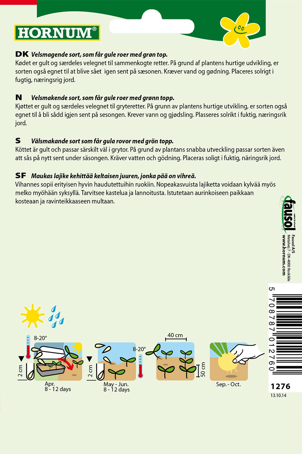 Kødet er gult og særdeles velegnet til sammenkogte retter. På grund af plantens hurtige udvikling, er sorten også egnet til at blive sået igen sent på sæsonen. Kræver vand og gødning. Placeres solrigt i fugtig, næringsrig jord.