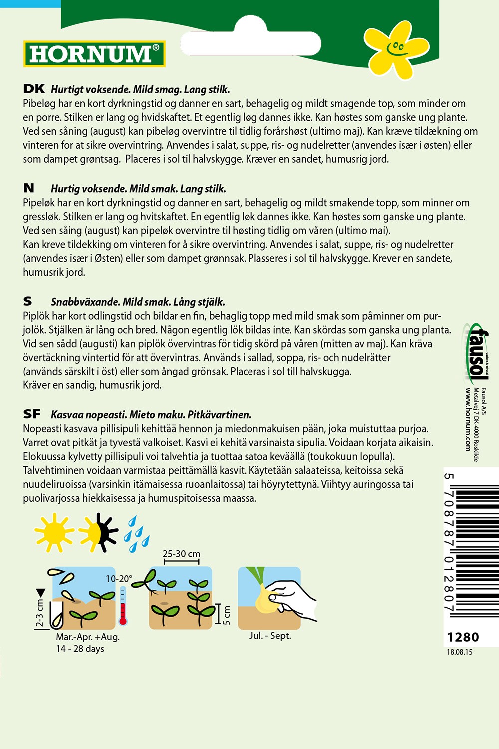 Pibeløg har en kort dyrkningstid og danner en sart, behagelig og mildt smagende top, som minder om en porre. Stilken er lang og hvidskaftet. Et egentlig løg dannes ikke. Kan høstes som ganske ung plante. Ved sen såning (august) kan pibeløg overvintre til tidlig forårshøst (ultimo maj). Kan kræve tildækning om vinteren for at sikre overvintring. Anvendes i salat, suppe, ris- og nudelretter (anvendes især i østen) eller som dampet grøntsag. Placeres i sol til halvskygge. Kræver en sandet, humusrig jord.