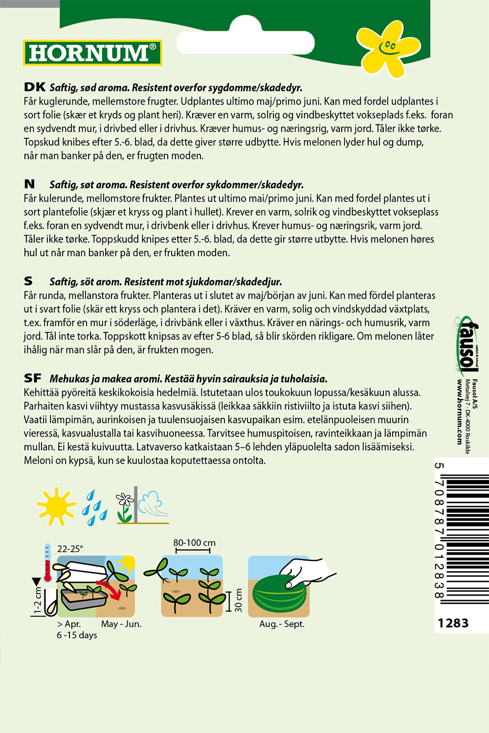 Får kuglerunde, mellemstore frugter. Udplantes ultimo maj/primo juni. Kan med fordel udplantes i sort folie (skær et kryds og plant heri). Kræver en varm, solrig og vindbeskyttet vokseplads f.eks. foran en sydvendt mur, i drivbed eller i drivhus. Kræver humus- og næringsrig, varm jord. Tåler ikke tørke. Topskud knibes efter 5.-6. blad, da dette giver større udbytte. Hvis melonen lyder hul og dump, når man banker på den, er frugten moden.