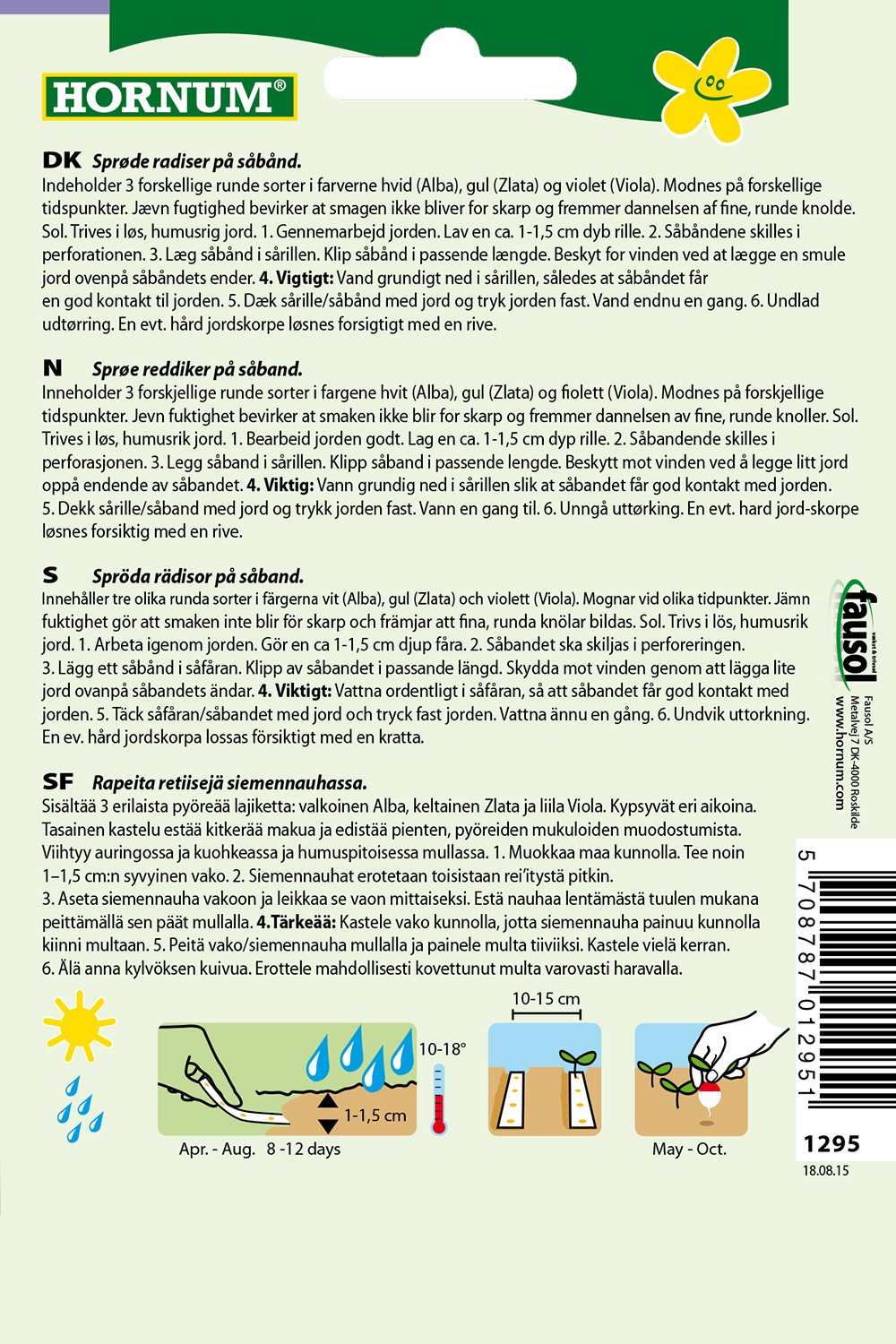 Indeholder 3 forskellige runde sorter i farverne hvid (Alba), gul (Zlata) og violet (Viola). Modnes på forskellige tidspunkter. Jævn fugtighed bevirker at smagen ikke bliver for skarp og fremmer dannelsen af fine, runde knolde. Sol. Trives i løs, humusrig jord. Gennemarbejd jorden. Lav en ca. 1-1,5 cm dyb rille. Såbåndene skilles i perforationen. Læg såbånd i sårillen. Klip såbånd i passende længde. Beskyt for vinden ved at lægge en smule jord ovenpå såbåndets ender. Vigtigt: Vand grundigt ned i sårillen, således at såbåndet får en god kontakt til jorden. Dæk sårille/såbånd med jord og tryk jorden fast. Vand endnu en gang. Undlad udtørring. En evt. hård jordskorpe løsnes forsigtigt med en rive.