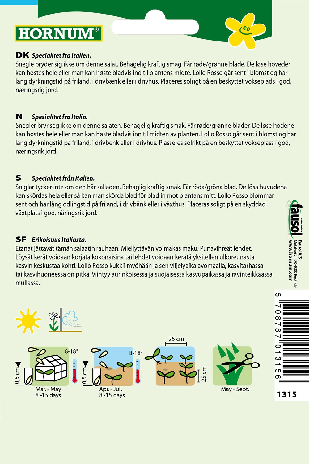 Snegle bryder sig ikke om denne salat. Behagelig kraftig smag. Får røde/grønne blade. De løse hoveder kan høstes hele eller man kan høste bladvis ind til plantens midte. Lollo Rosso går sent i blomst og har lang dyrkningstid på friland, i drivbænk eller i drivhus. Placeres solrigt på en beskyttet vokseplads i god, næringsrig jord.