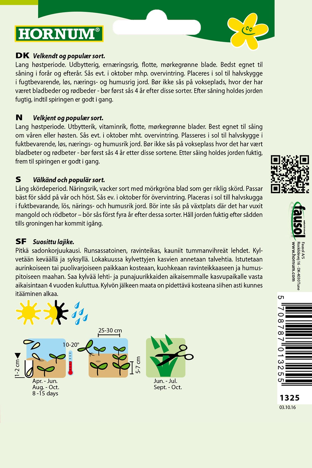 Lang høstperiode. Udbytterig, ernæringsrig, middeltidlig med mørkegrønne blade. Bedst egnet til såning i forår og efterår. Sås evt. i oktober mhp. overvintring. Placeres i sol til halvskygge i fugtbevarende, løs, nærings- og humusrig jord. Bør ikke sås på vokseplads, hvor der har været bladbeder og rødbeder - bør først sås 4 år efter disse sorter.