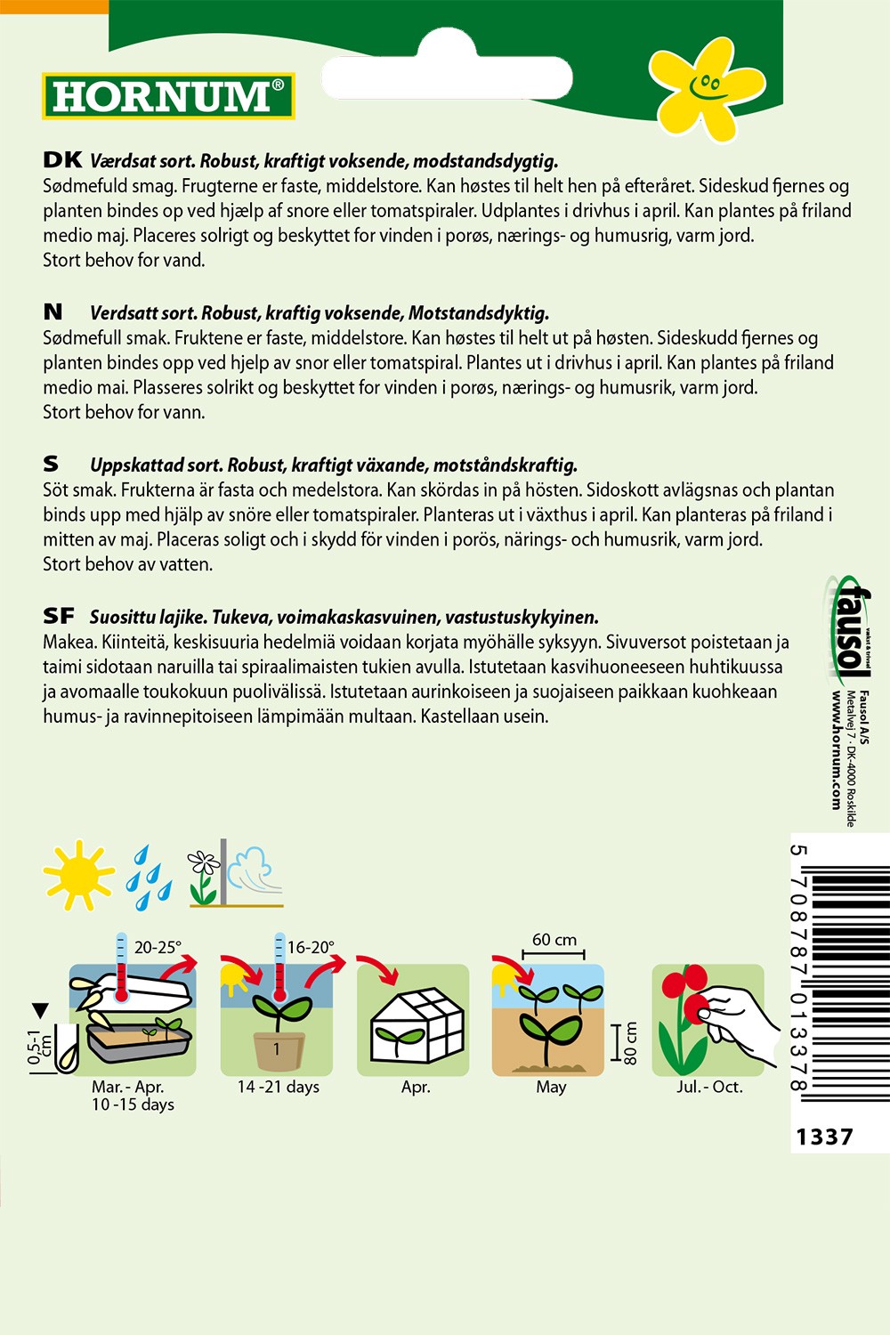 Sødmefuld smag. Frugterne er faste, middelstore. Kan høstes til helt hen på efteråret. Sideskud fjernes og planten bindes op ved hjælp af snore eller tomatspiraler. Udplantes i drivhus i april. Kan plantes på friland medio maj. Placeres solrigt og beskyttet for vinden i porøs, nærings- og humusrig, varm jord. Stort behov for vand.