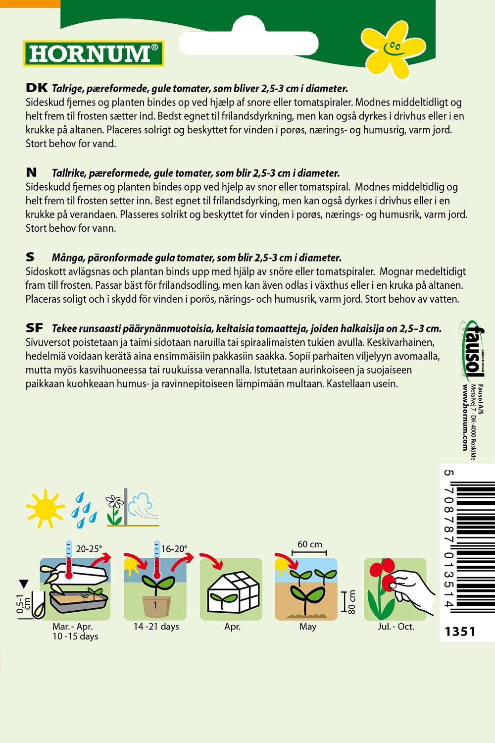 Sideskud fjernes og planten bindes op ved hjælp af snore eller tomatspiraler. Modnes middeltidligt og helt frem til frosten sætter ind. Bedst egnet til frilandsdyrkning, men kan også dyrkes i drivhus eller i en krukke på altanen. Placeres solrigt og beskyttet for vinden i porøs, nærings- og humusrig, varm jord. Stort behov for vand.