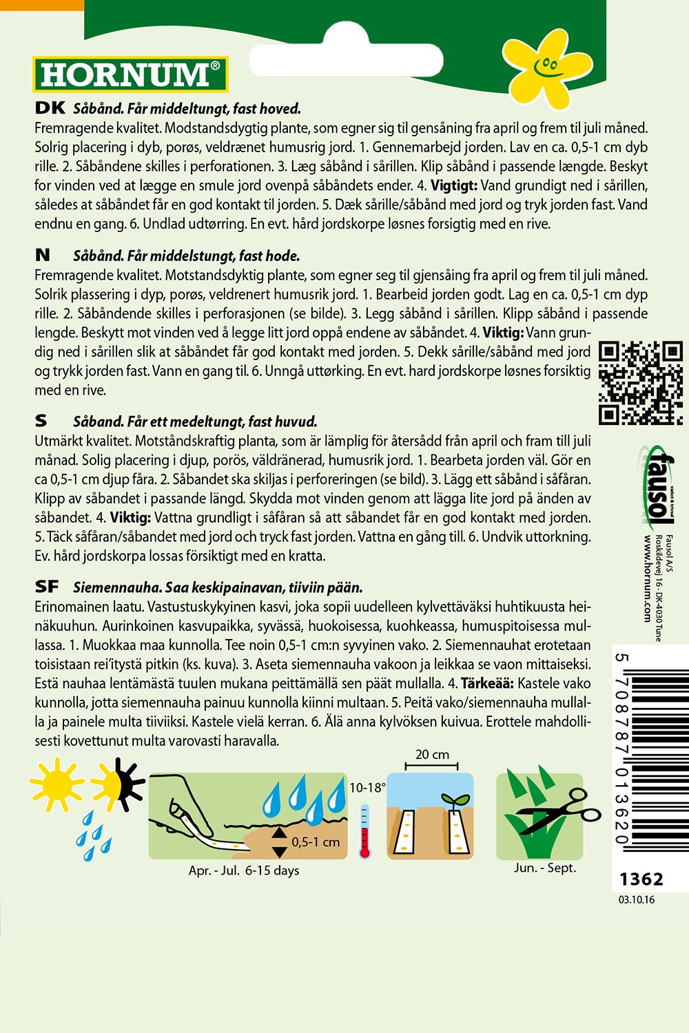 Fremragende kvalitet. Modstandsdygtig plante, som egner sig til gensåning fra april og frem til juli måned. Solrig placering i dyb, porøs, veldrænet humusrig jord. Gennemarbejd jorden. Lav en ca. 0,5-1 cm dyb rille. Såbåndene skilles i perforationen. Læg såbånd i sårillen. Klip såbånd i passende længde. Beskyt for vinden ved at lægge en smule jord ovenpå såbåndets ender. Vigtigt: Vand grundigt ned i sårillen, således at såbåndet får en god kontakt til jorden. Dæk sårille/såbånd med jord og tryk jorden fast. Vand endnu en gang. Undlad udtørring. En evt. hård jordskorpe løsnes forsigtig med en rive.