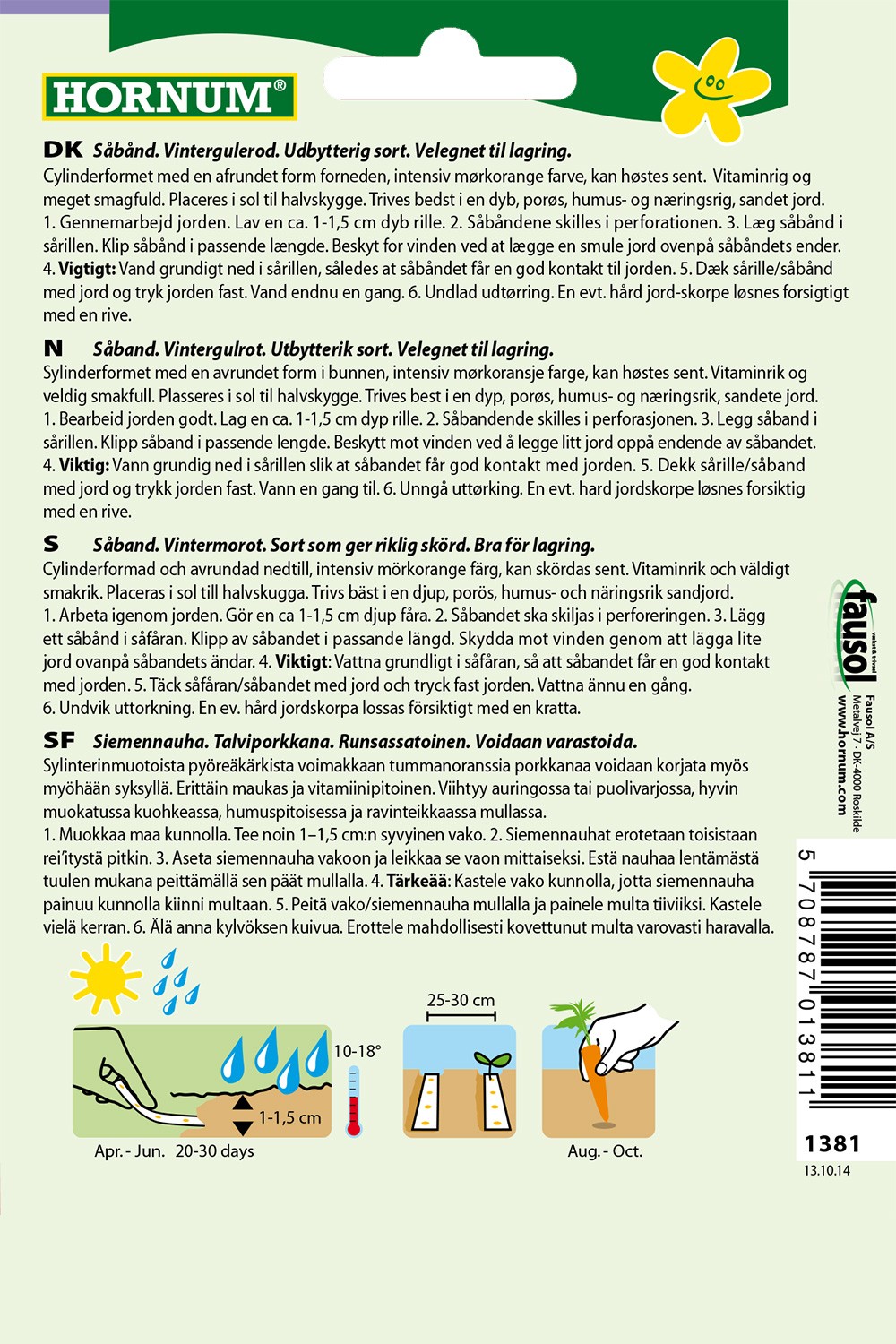 Cylinderformet med en afrundet form forneden, intensiv mørkorange farve, kan høstes sent. Vitaminrig og meget smagfuld. Placeres i sol til halvskygge. Trives bedst i en dyb, porøs, humus- og næringsrig, sandet jord. Gennemarbejd jorden. Lav en ca. 1-1,5 cm dyb rille. Såbåndene skilles i perforationen. Læg såbånd i sårillen. Klip såbånd i passende længde. Beskyt for vinden ved at lægge en smule jord ovenpå såbåndets ender. Vigtigt: Vand grundigt ned i sårillen, således at såbåndet får en god kontakt til jorden. Dæk sårille/såbånd med jord og tryk jorden fast. Vand endnu en gang. Undlad udtørring. En evt. hård jord-skorpe løsnes forsigtigt med en rive.