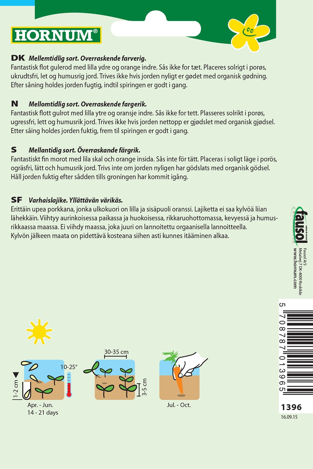 Fantastisk flot gulerod med lilla ydre og orange indre. Sås ikke for tæt. Placeres solrigt i porøs, ukrudtsfri, let og humusrig jord. Trives ikke hvis jorden nyligt er gødet med organisk gødning. Efter såning holdes jorden fugtig, indtil spiringen er godt i gang.