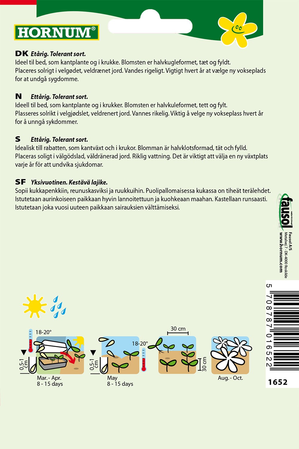 Ideel til bed, som kantplante og i krukke. Blomsten er halvkugleformet, tæt og fyldt. Placeres solrigt i velgødet, veldrænet jord. Vandes rigeligt. Vigtigt hvert år at vælge ny vokseplads for at undgå sygdomme.