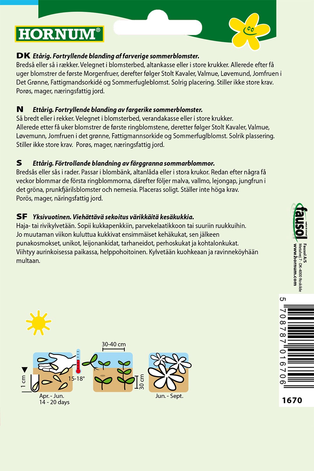 Bredså eller så i rækker. Velegnet i blomsterbed, altankasse eller i store krukker. Allerede efter få uger blomstrer de første Morgenfruer, derefter følger Stolt Kavaler, Valmue, Løvemund, Jomfruen i Det Grønne, Fattigmandsorkidé og Sommerfugleblomst. Solrig placering. Stiller ikke store krav. Porøs, mager, næringsfattig jord.