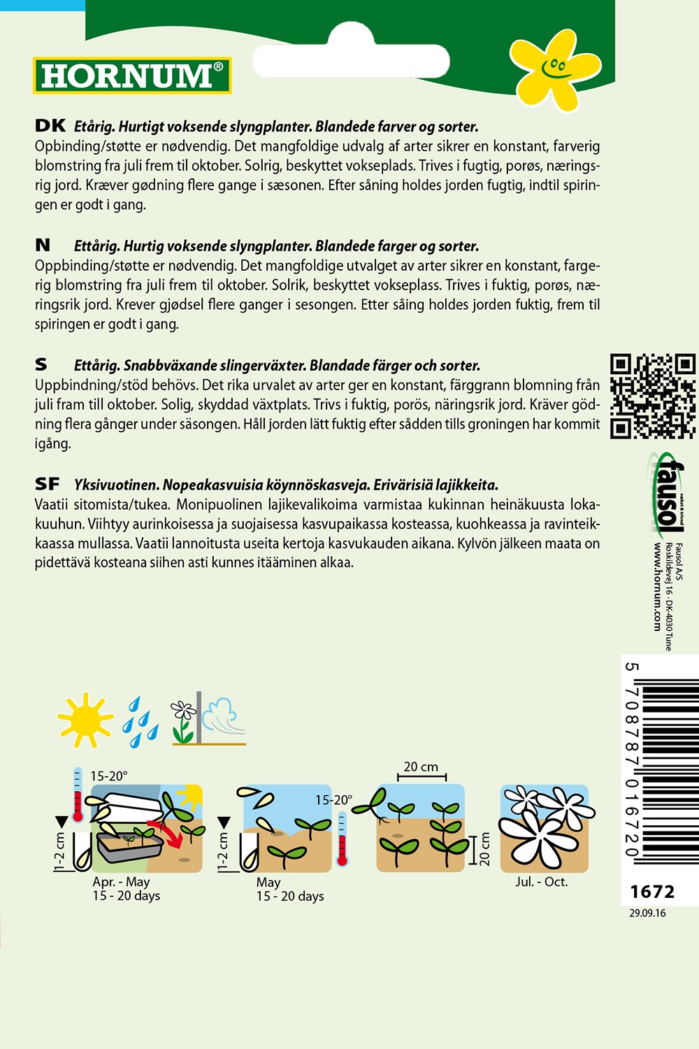 Opbinding/støtte er nødvendig. Det mangfoldige udvalg af arter sikrer en konstant, farverig blomstring fra juli frem til oktober. Solrig, beskyttet vokseplads. Trives i fugtig, porøs, næringsrig jord. Kræver gødning flere gange i sæsonen.