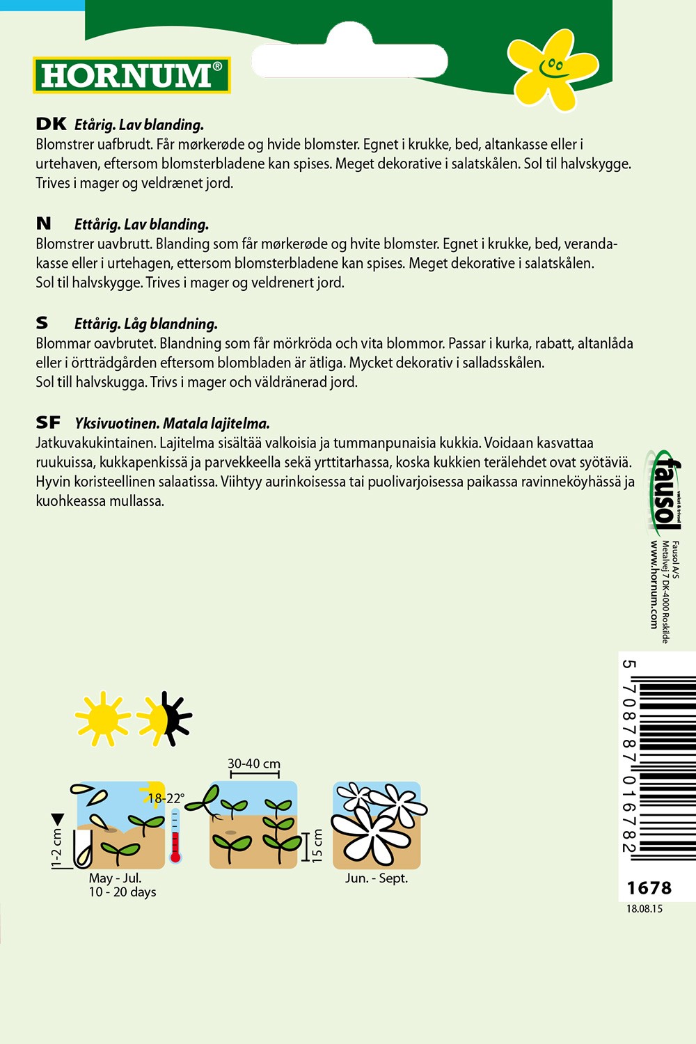 Blomstrer uafbrudt. Får mørkerøde og hvide blomster. Egnet i krukke, bed, altankasse eller i urtehaven, eftersom blomsterbladene kan spises. Meget dekorative i salatskålen. Sol til halvskygge. Trives i mager og veldrænet jord.
