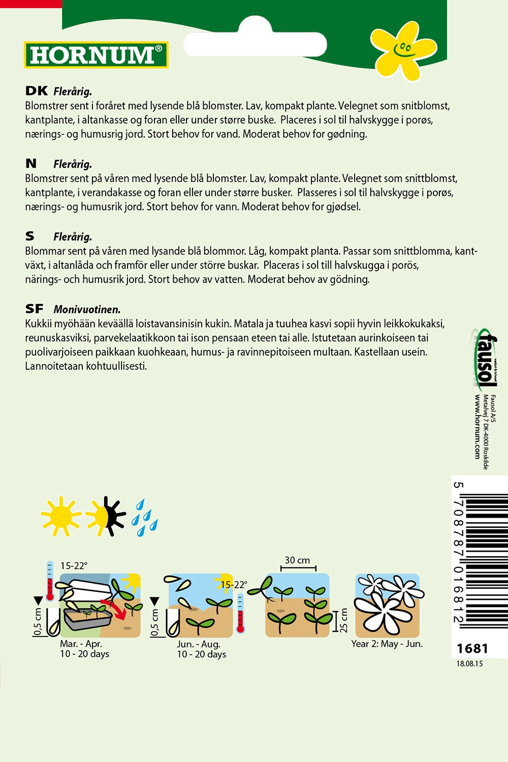 Blomstrer sent i foråret med lysende blå blomster. Lav, kompakt plante. Velegnet som snitblomst, kantplante, i altankasse og foran eller under større buske. Placeres i sol til halvskygge i porøs, nærings- og humusrig jord. Stort behov for vand. Moderat behov for gødning.