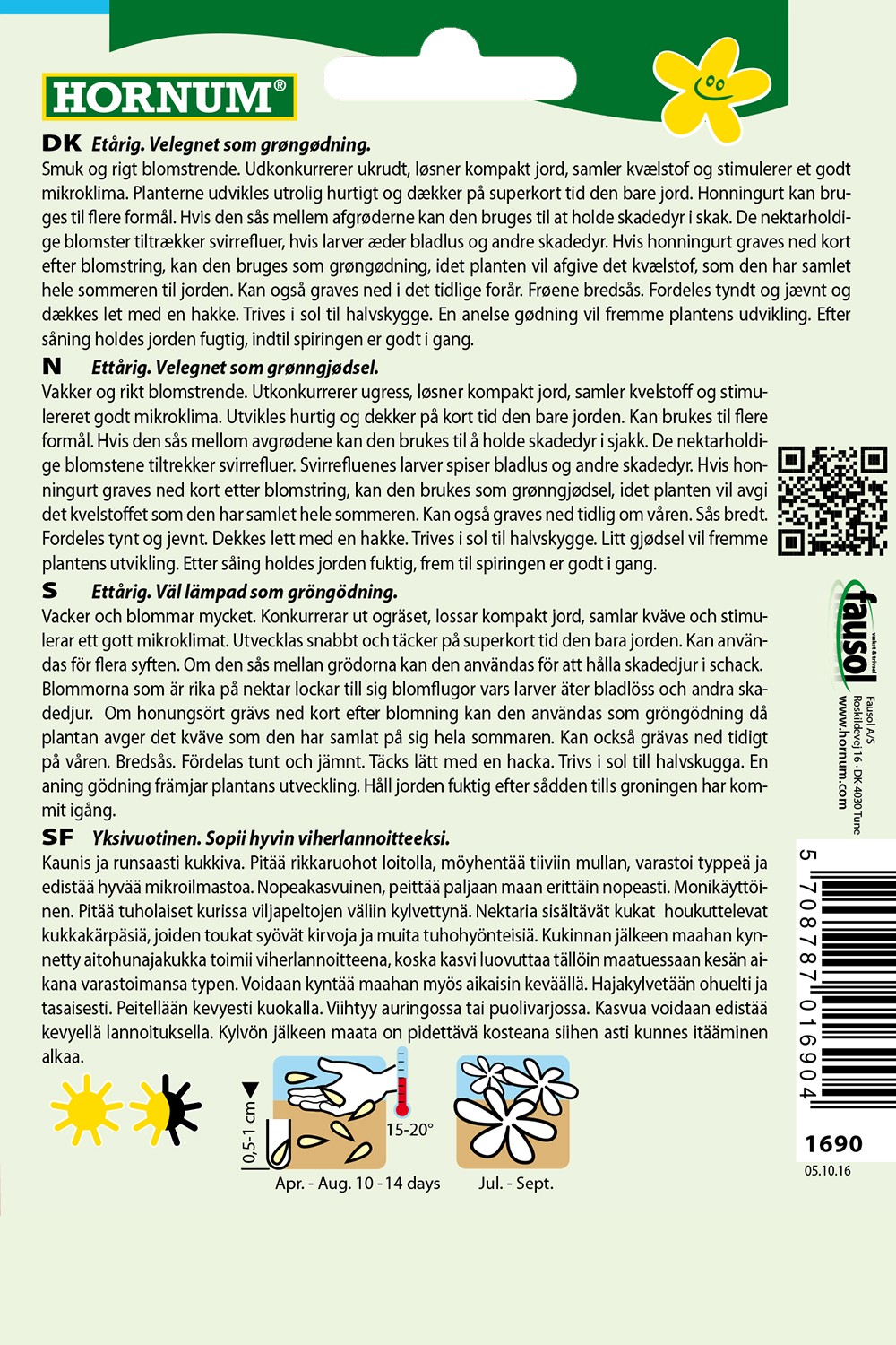 Smuk og rigt blomstrende. Udkonkurrerer ukrudt, løsner kompakt jord, samler kvælstof og stimulerer et godt mikroklima. Planterne udvikles utrolig hurtigt og dækker på superkort tid den bare jord. Honningurt kan bruges til flere formål. Hvis den sås mellem afgrøderne kan den bruges til at holde skadedyr i skak. De nektarholdige blomster tiltrækker svirrefluer, hvis larver æder bladlus og andre skadedyr. Hvis honningurt graves ned kort efter blomstring, kan den bruges som grøngødning, idet planten vil afgive det kvælstof, som den har samlet hele sommeren til jorden. Kan også graves ned i det tidlige forår. Frøene bredsås. Fordeles tyndt og jævnt og dækkes let med en hakke. Trives i sol til halvskygge. En anelse gødning vil fremme plantens udvikling.