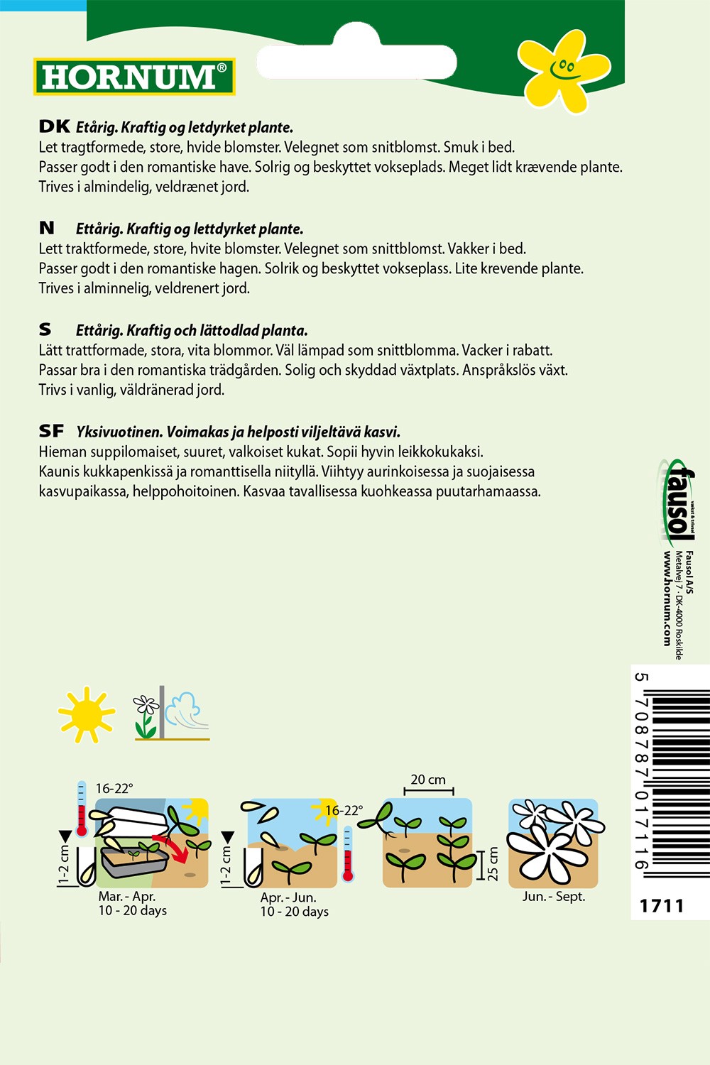 Let tragtformede, store, hvide blomster. Velegnet som snitblomst. Smuk i bed. Passer godt i den romantiske have. Solrig og beskyttet vokseplads. Meget lidt krævende plante. Trives i almindelig, veldrænet jord.
