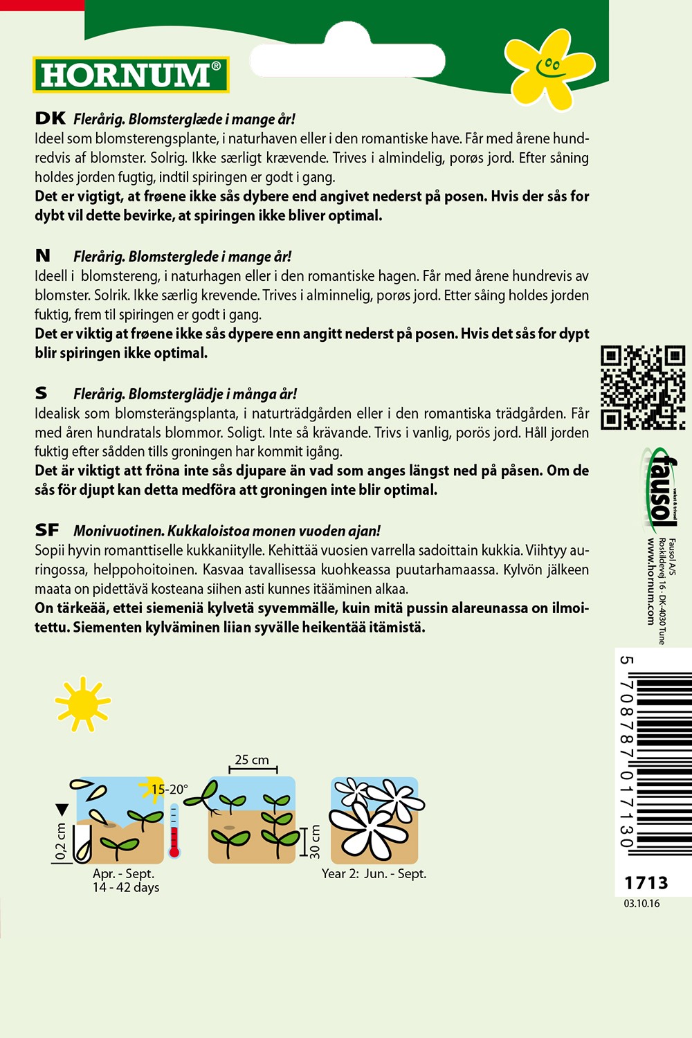 Ideel som blomsterengsplante, i naturhaven eller i den romantiske have. Får med årene hundredvis af blomster. Solrig. Ikke særligt krævende. Trives i almindelig, porøs jord. Det er vigtigt, at frøene ikke sås dybere end angivet nederst på posen. Hvis der sås for dybt vil dette bevirke, at spiringen ikke bliver optimal.