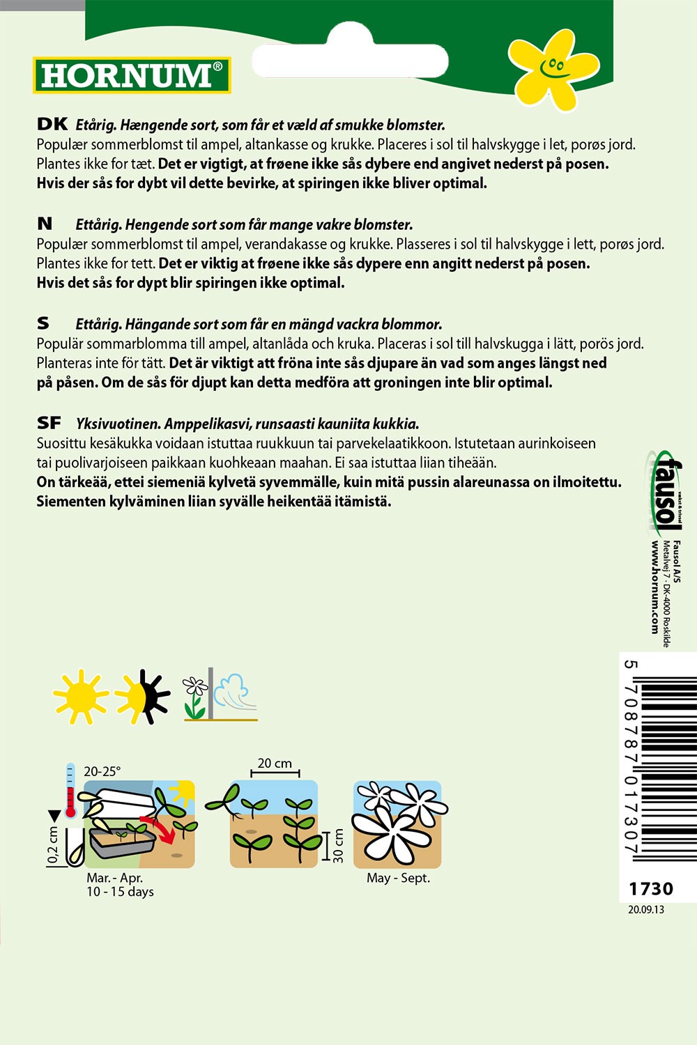 Populær sommerblomst til ampel, altankasse og krukke. Placeres i sol til halvskygge i let, porøs jord. Plantes ikke for tæt. Det er vigtigt, at frøene ikke sås dybere end angivet nederst på posen. Hvis der sås for dybt vil dette bevirke, at spiringen ikke bliver optimal.