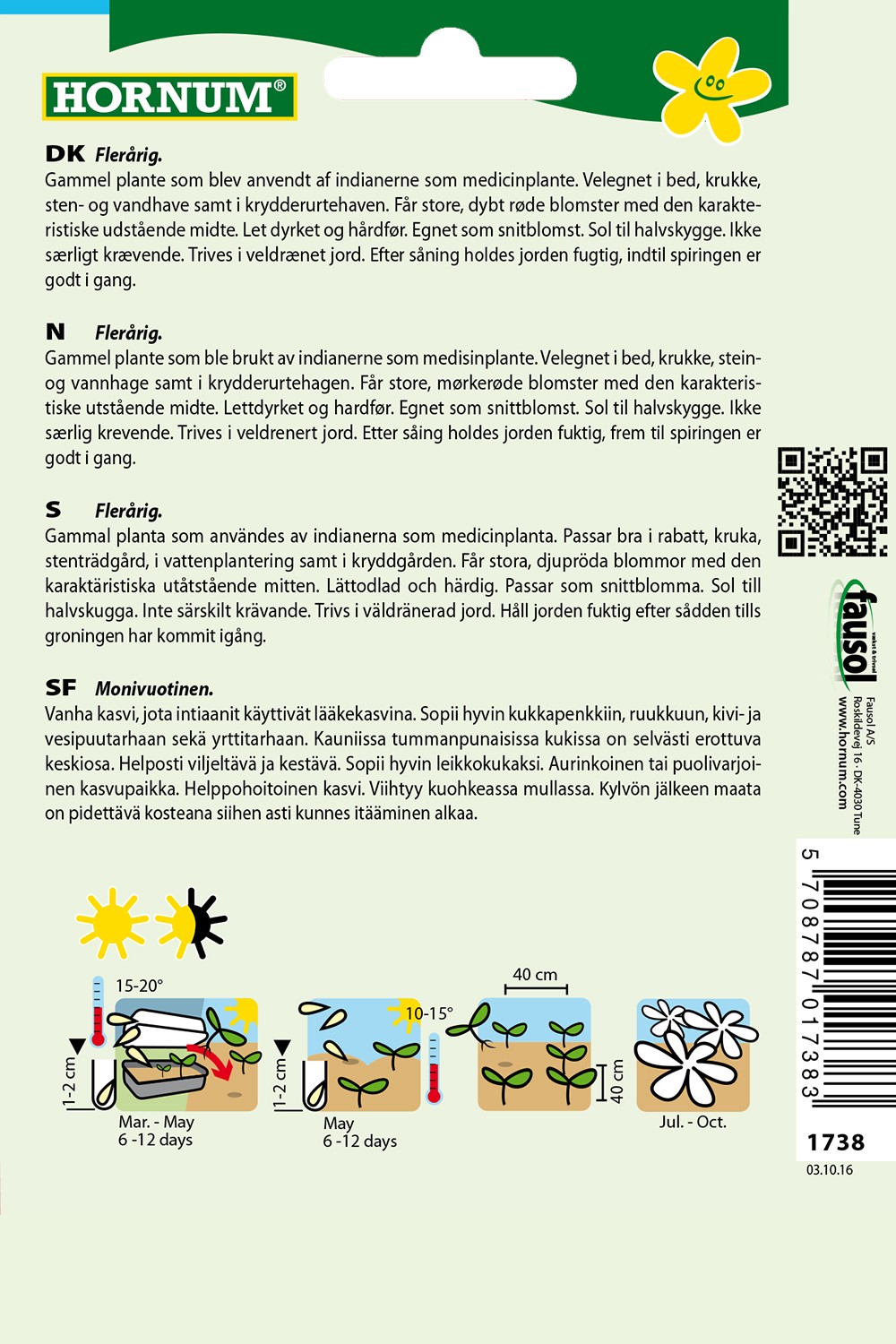 Gammel plante som blev anvendt af indianerne som medicinplante. Velegnet i bed, krukke, sten- og vandhave samt i krydderurtehaven. Får store, dybt røde blomster med den karakteristiske udstående midte. Let dyrket og hårdfør. Egnet som snitblomst. Sol til halvskygge. Ikke særligt krævende. Trives i veldrænet jord.