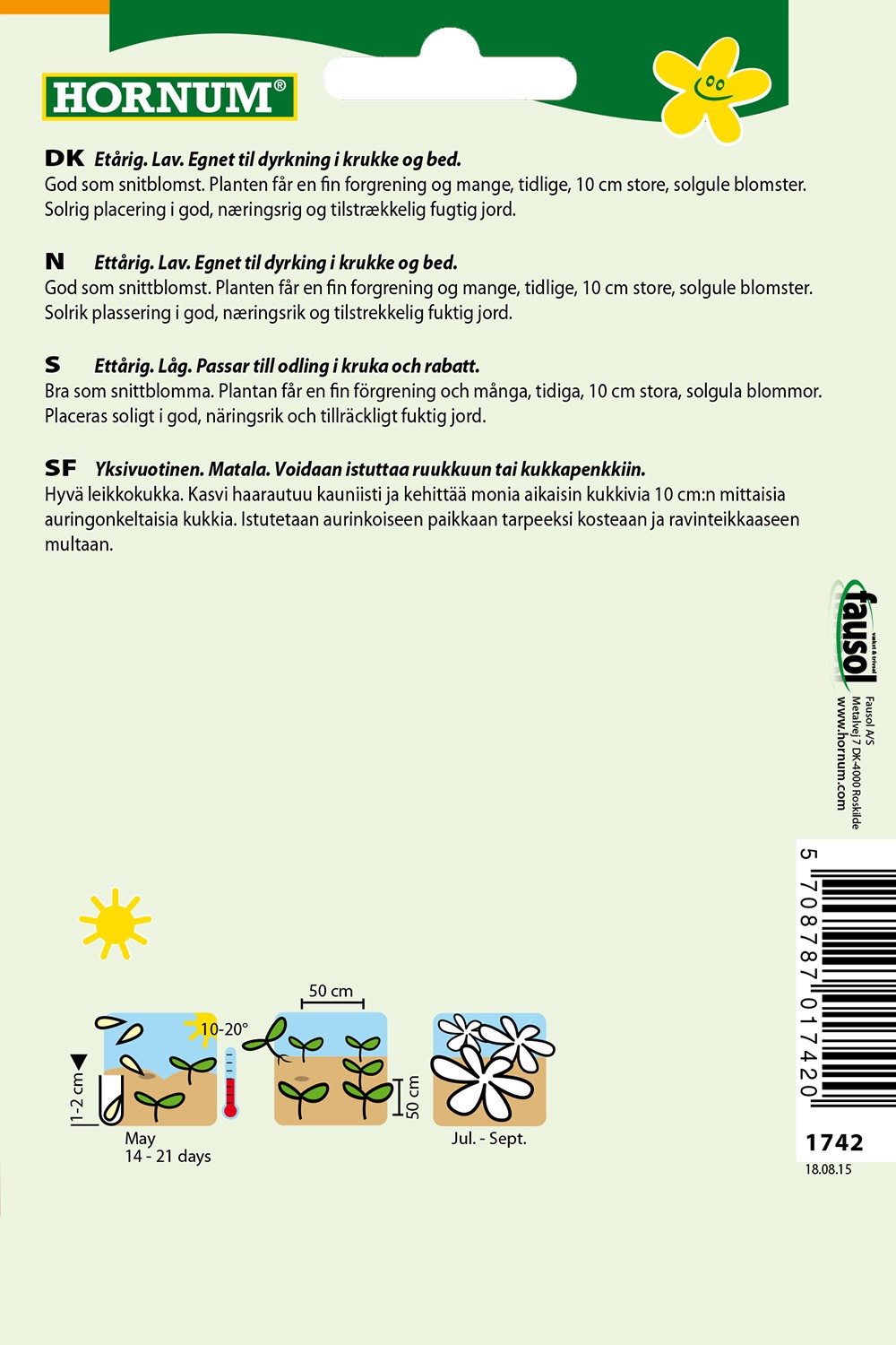 God som snitblomst. Planten får en fin forgrening og mange, tidlige, 10 cm store, solgule blomster. Solrig placering i god, næringsrig og tilstrækkelig fugtig jord.