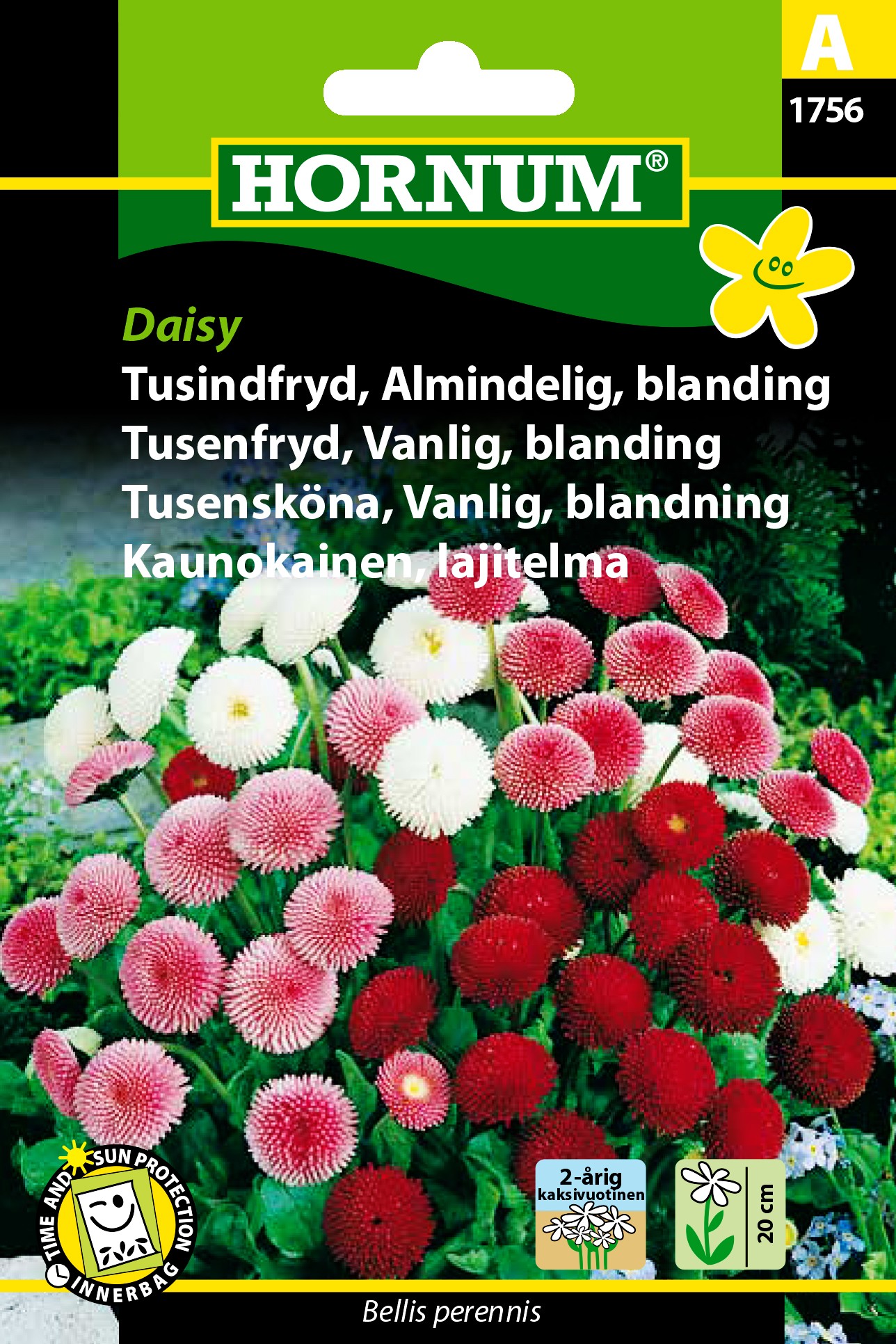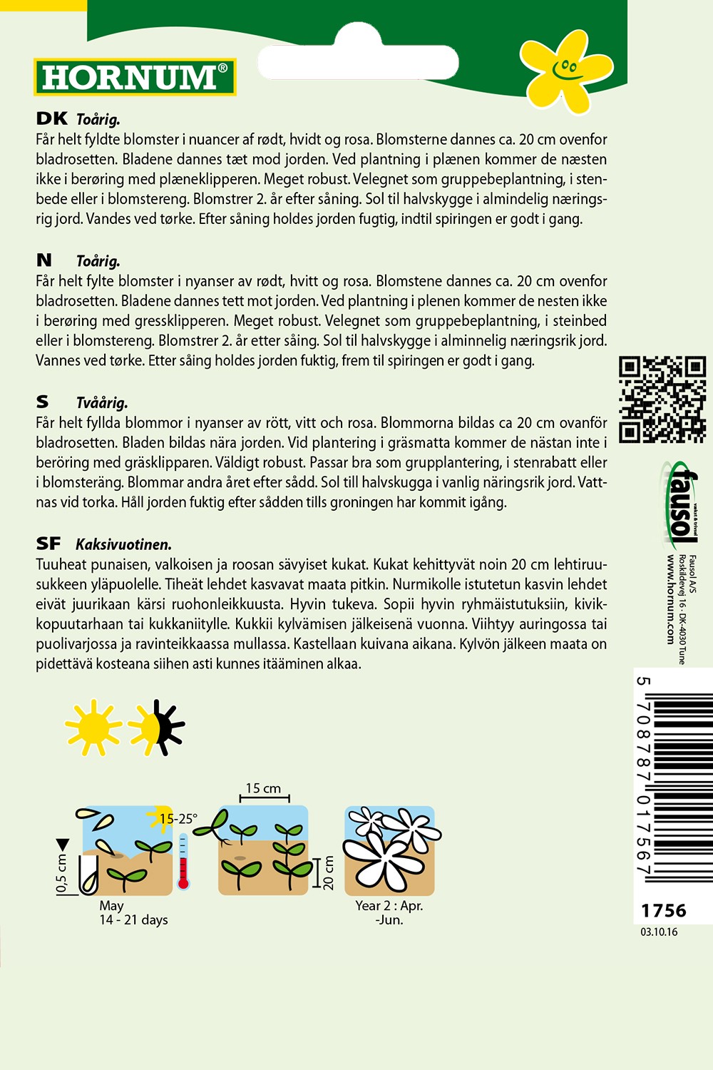 Får helt fyldte blomster i nuancer af rødt, hvidt og rosa. Blomsterne dannes ca. 20 cm ovenfor bladrosetten. Bladene dannes tæt mod jorden. Ved plantning i plænen kommer de næsten ikke i berøring med plæneklipperen. Meget robust. Velegnet som gruppebeplantning, i stenbede eller i blomstereng. Blomstrer 2. år efter såning. Sol til halvskygge i almindelig næringsrig jord. Vandes ved tørke.