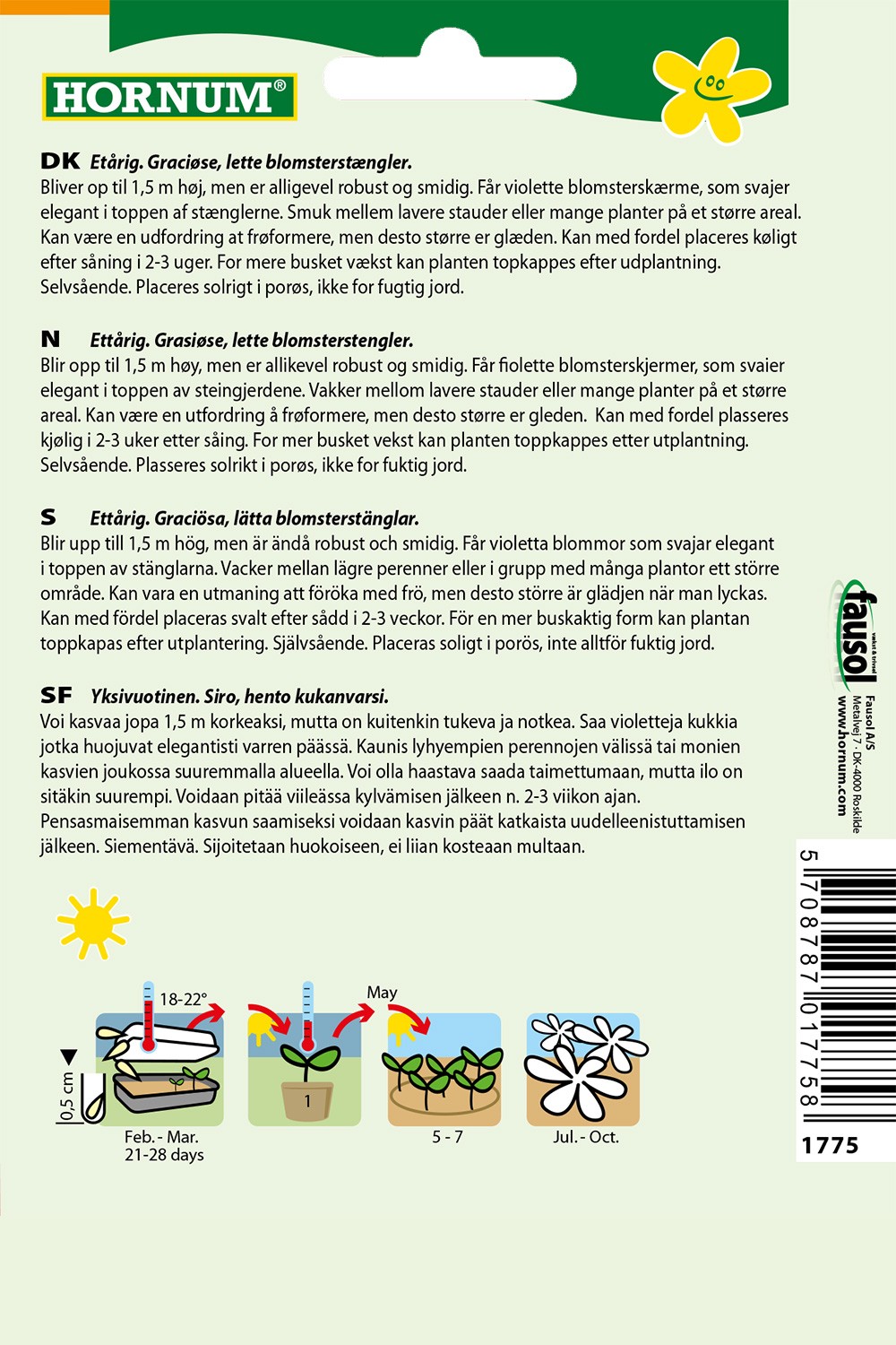 Bliver op til 1,5 m høj, men er alligevel robust og smidig. Får violette blomsterskærme, som svajer elegant i toppen af stænglerne. Smuk mellem lavere stauder eller mange planter på et større areal. Kan være en udfordring at frøformere, men desto større er glæden. Kan med fordel placeres køligt efter såning i 2-3 uger. For mere busket vækst kan planten topkappes efter udplantning. Selvsående. Placeres solrigt i porøs, ikke for fugtig jord.