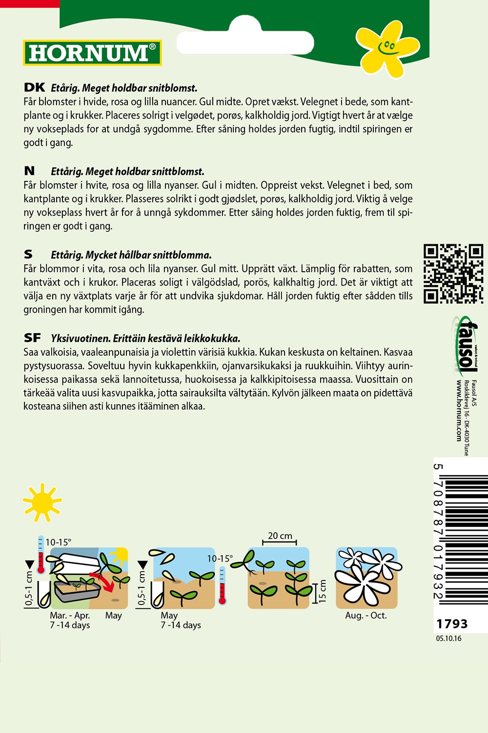 Får blomster i hvide, rosa og lilla nuancer. Gul midte. Opret vækst. Velegnet i bede, som kantplante og i krukker. Placeres solrigt i velgødet, porøs, kalkholdig jord. Vigtigt hvert år at vælge ny vokseplads for at undgå sygdomme.