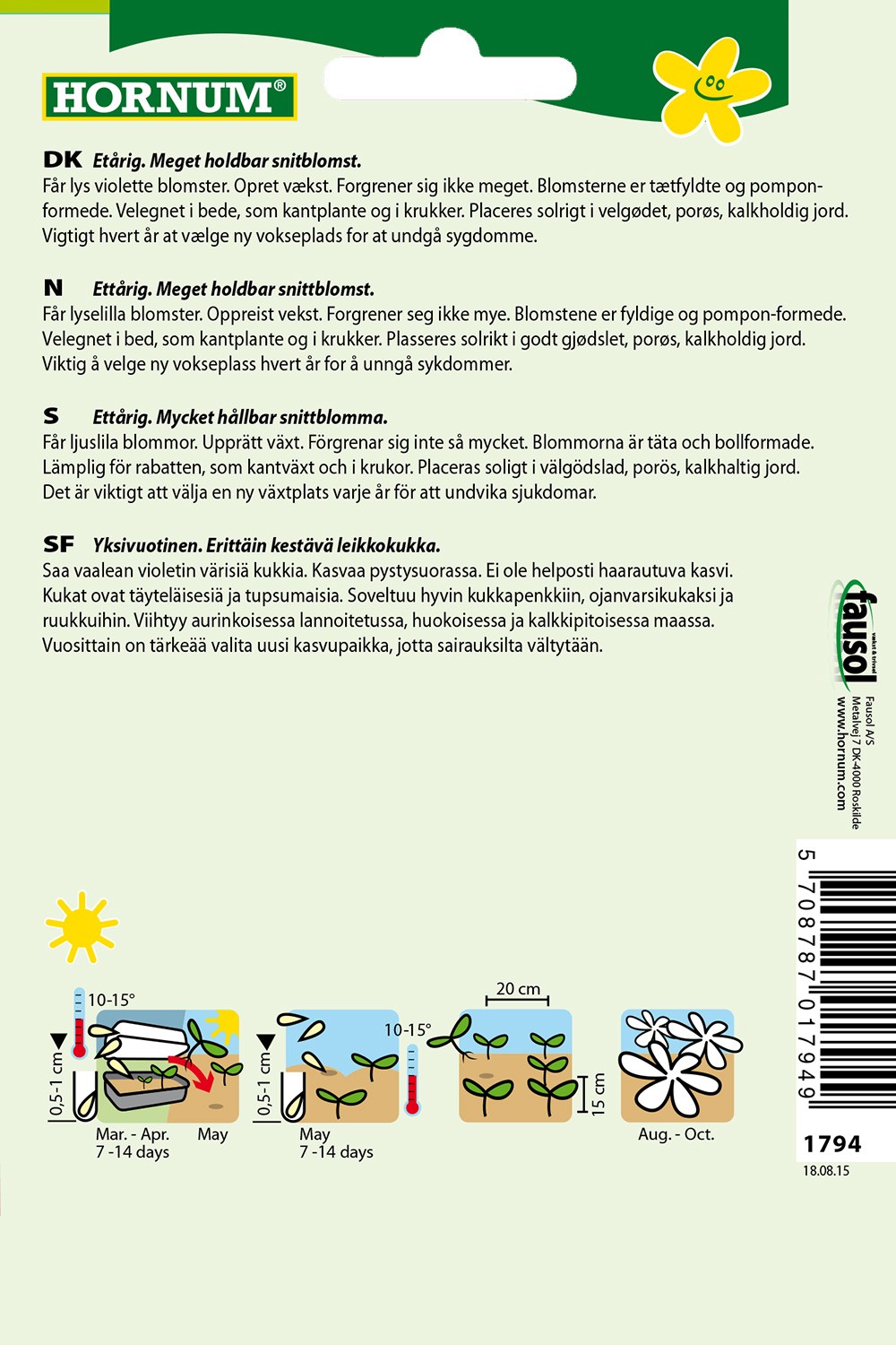 Får lys violette blomster. Opret vækst. Forgrener sig ikke meget. Blomsterne er tætfyldte og pomponformede. Velegnet i bede, som kantplante og i krukker. Placeres solrigt i velgødet, porøs, kalkholdig jord. Vigtigt hvert år at vælge ny vokseplads for at undgå sygdomme.